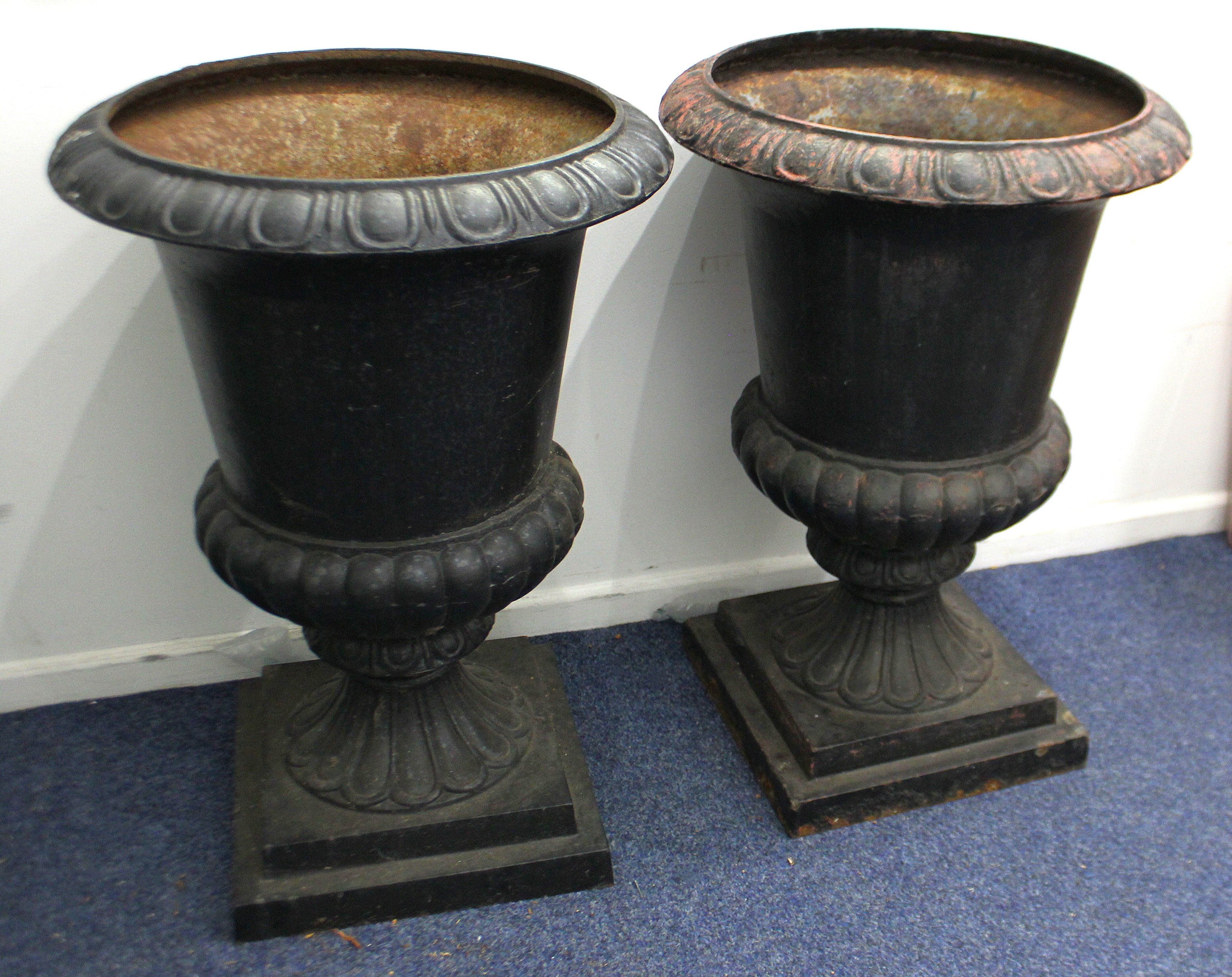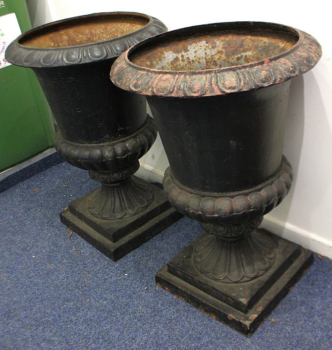 A pair of cast iron urns in a Georgian classical revival style, 81cm high.