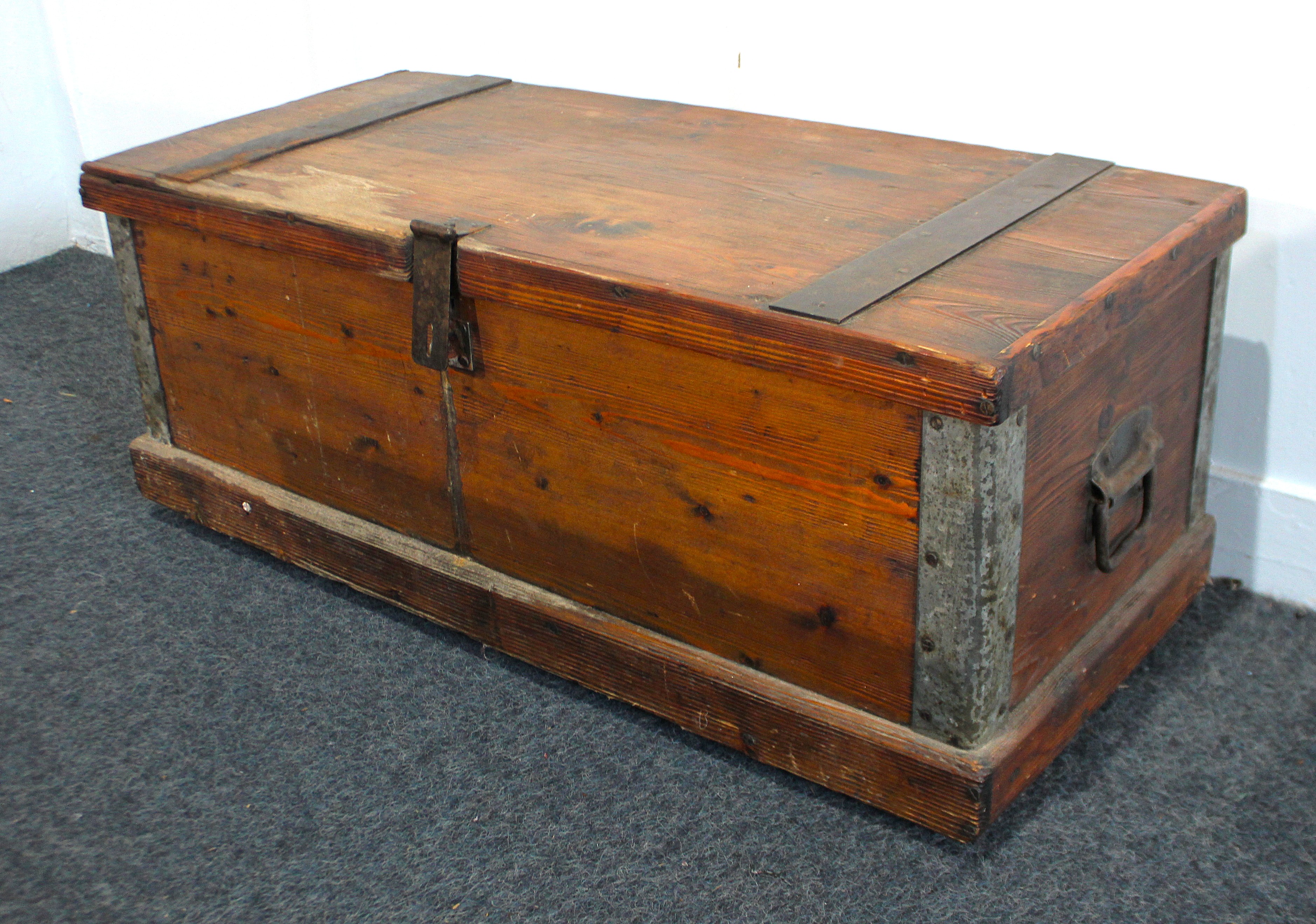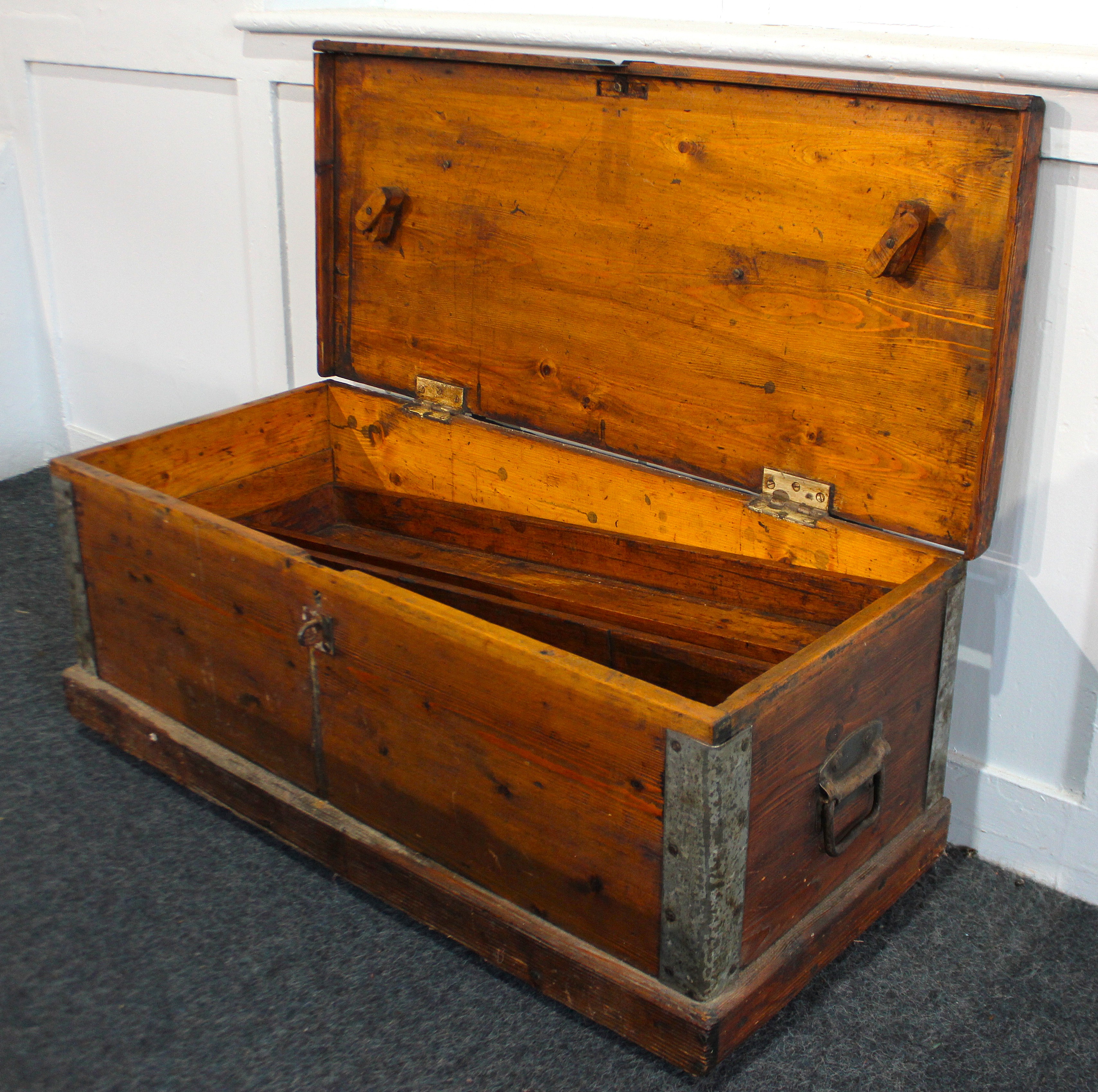A 19th century metal mounted pitch pine trunk, flanked by twin carrying handles, 90cm wide by 40cm deep by 36cm high.