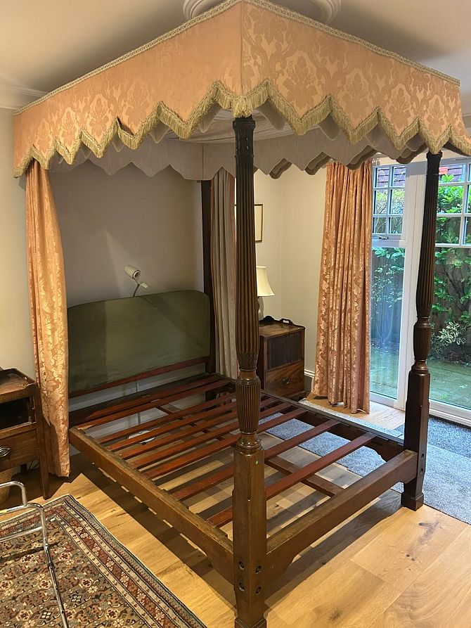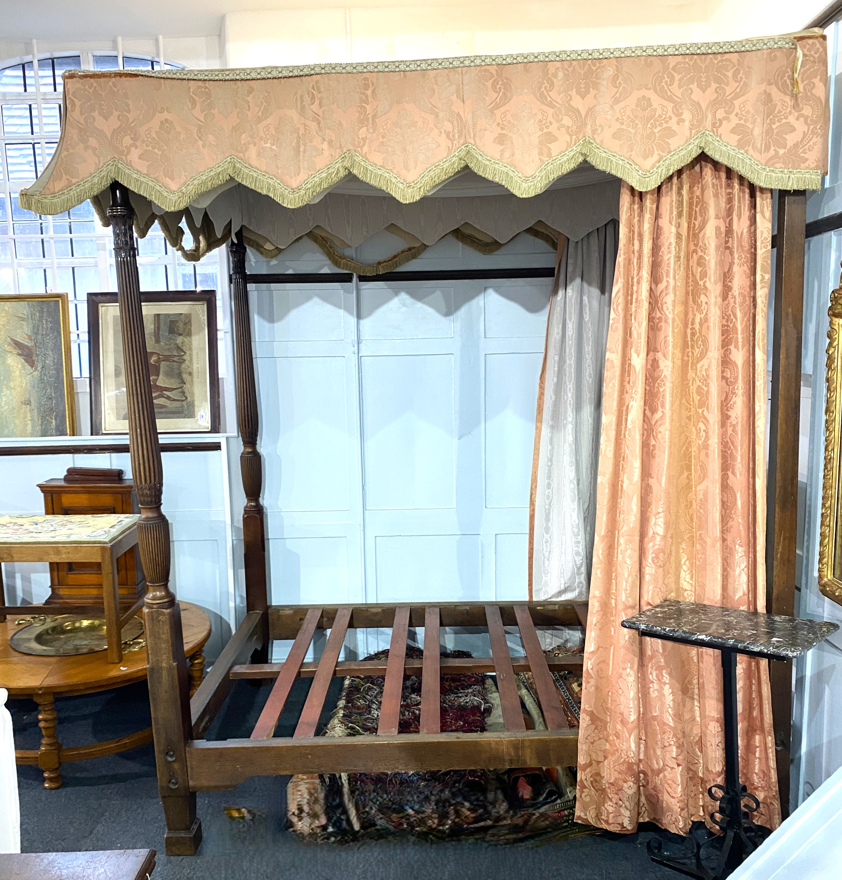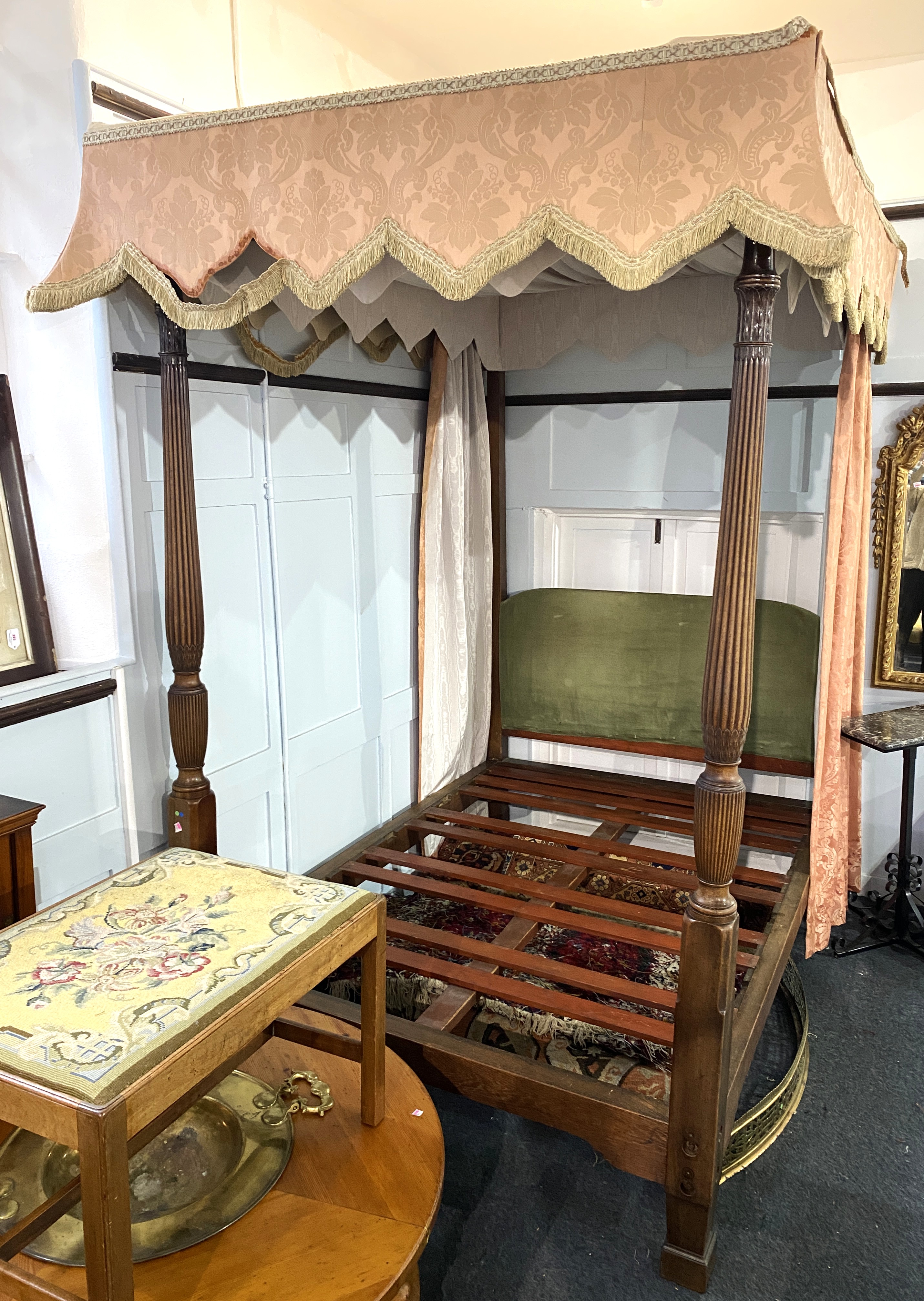 A good quality oak and mahogany four poster bed with upholstered panel headboard, reeded and acanthus carved turned and square section front posts and a supporting canopy, height 235cm, width 141cm, length 204cm