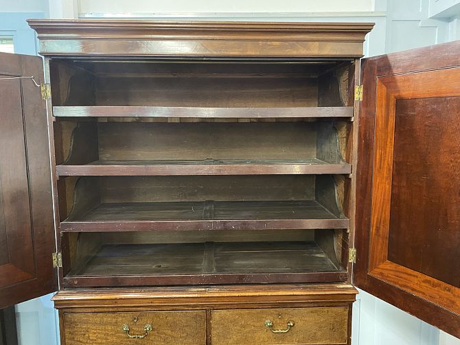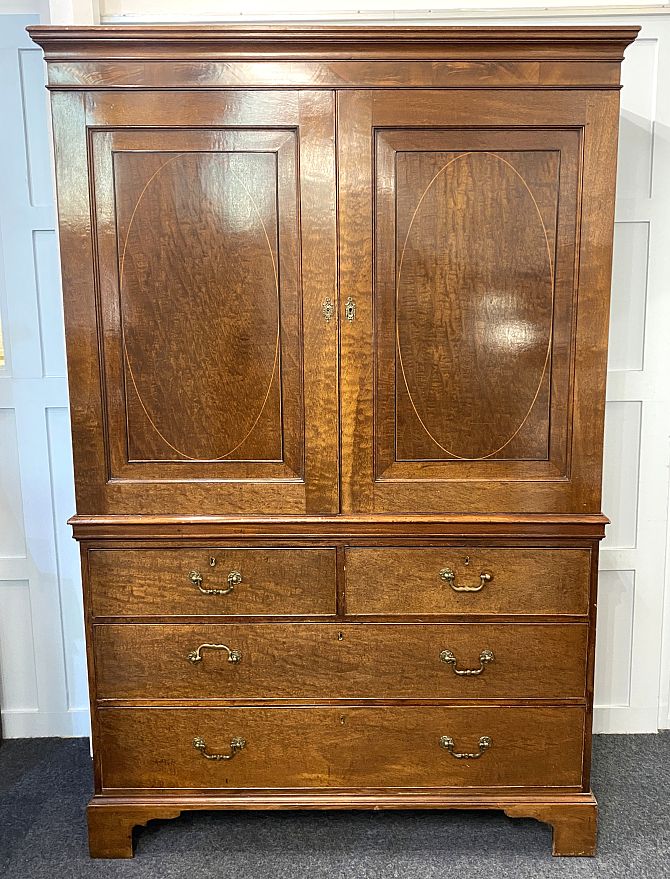 A George III mahogany linen press with a pair of oval inlaid doors enclosing sliding shelves, the base with two short over two long drawers on bracket feet, height 210cm, width 136cm, depth 64cm, with key