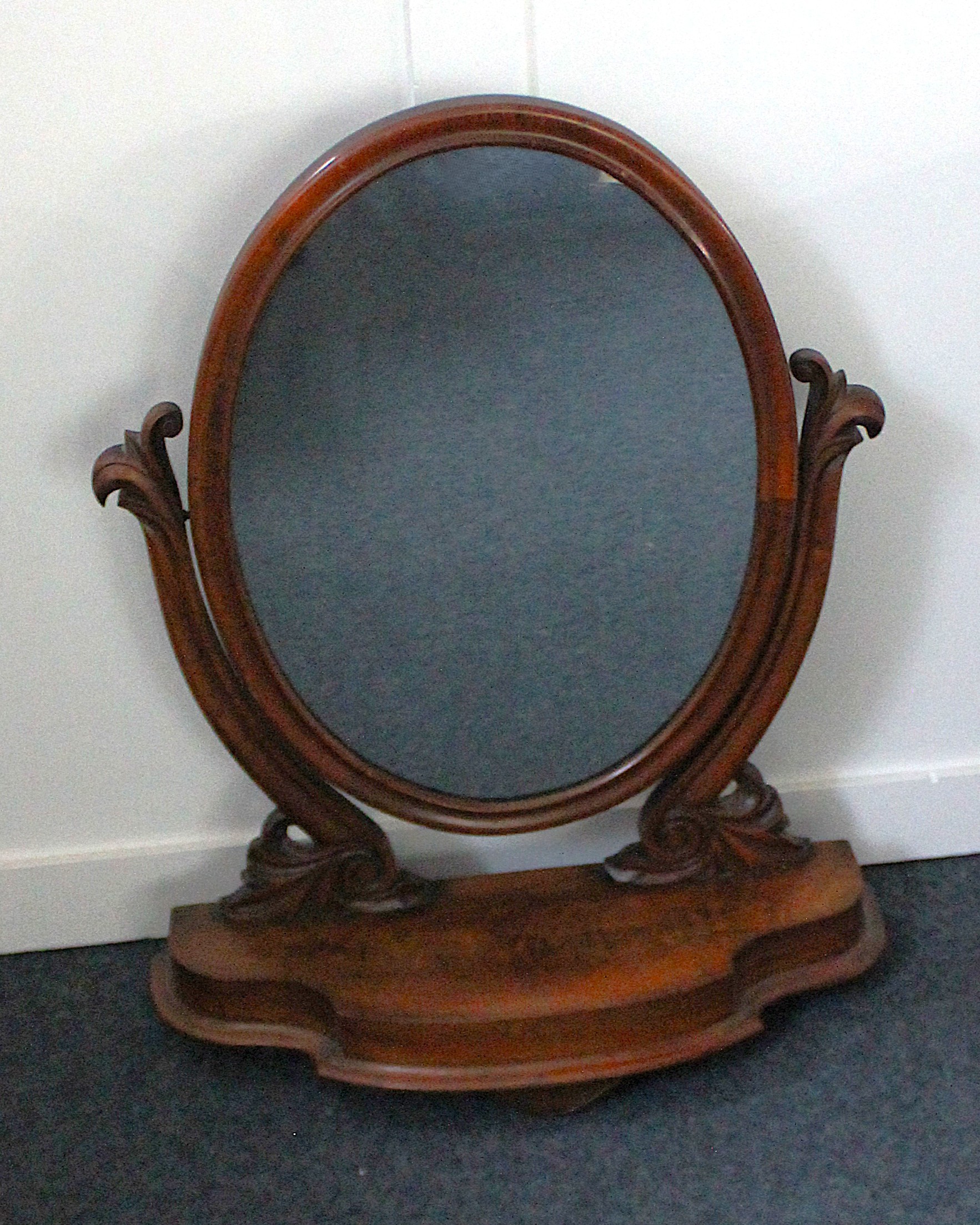 A 19th century mahogany dressing table mirror, with oval swing mirror on shaped uprights and shaped base, 83cm high by 88cm wide.
