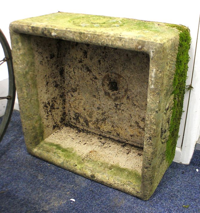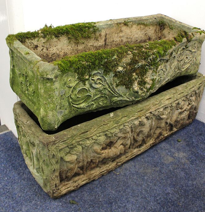 Three nicely weathered garden planters, period styles but of 20th century construction, 75cm, 75cm, and 51cm wide, (3).