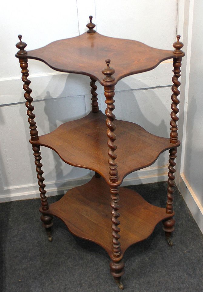 A Victorian mahogany three tier what-not with serpentine shaped shelves on barley twist supports to castors, height 89cm, width 45cm, depth 35cm (a/f)