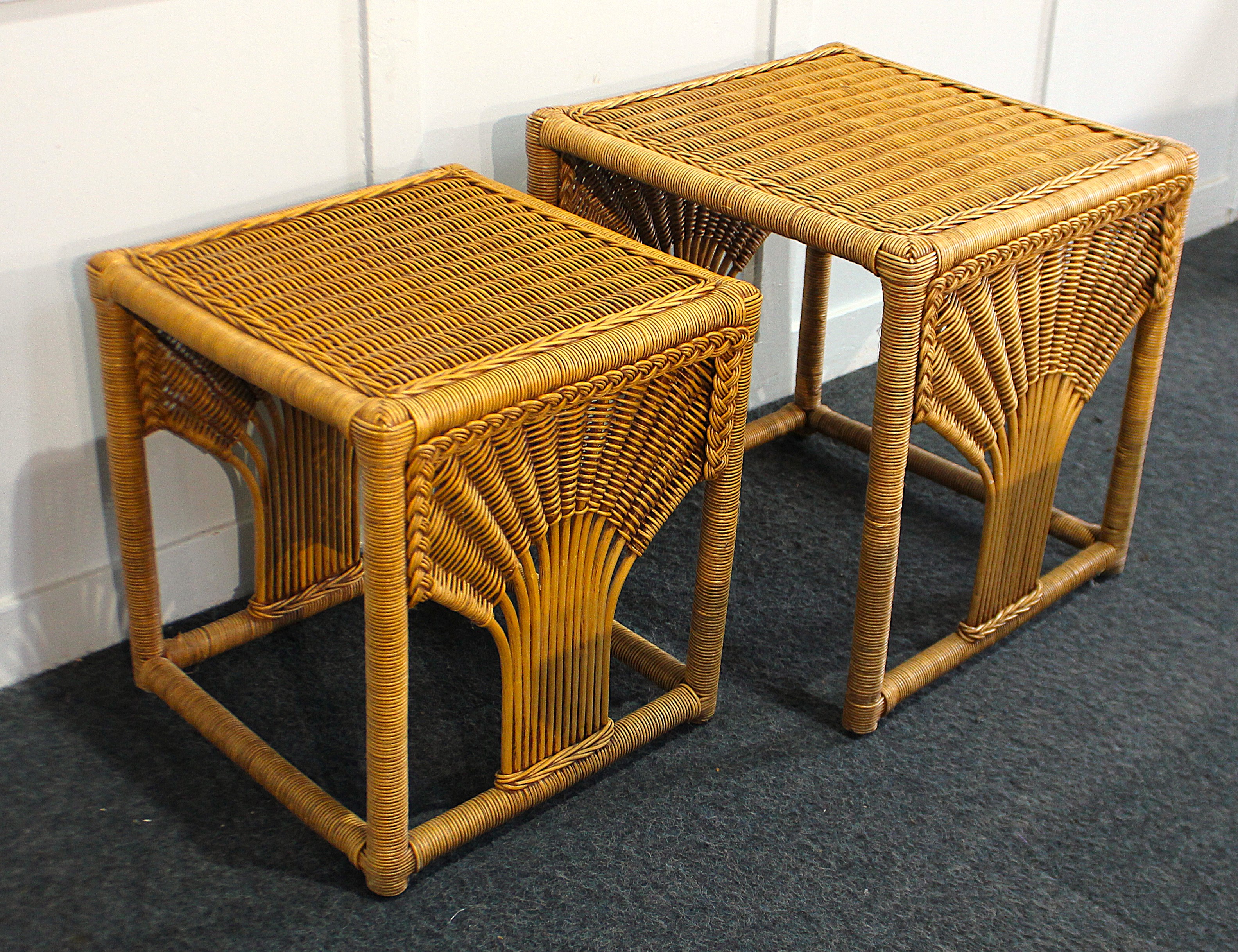 A graduated pair of rattan side tables, larger 52cm square by 53cm high.