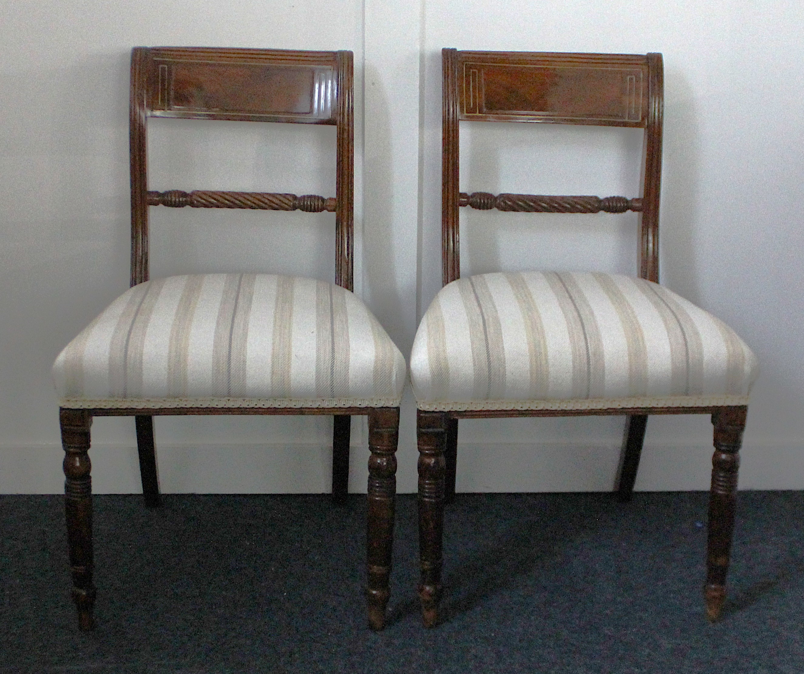 A pair of George IV brass inlaid mahogany side chairs, c.1820/30, with contemporary re-upholstered seats.