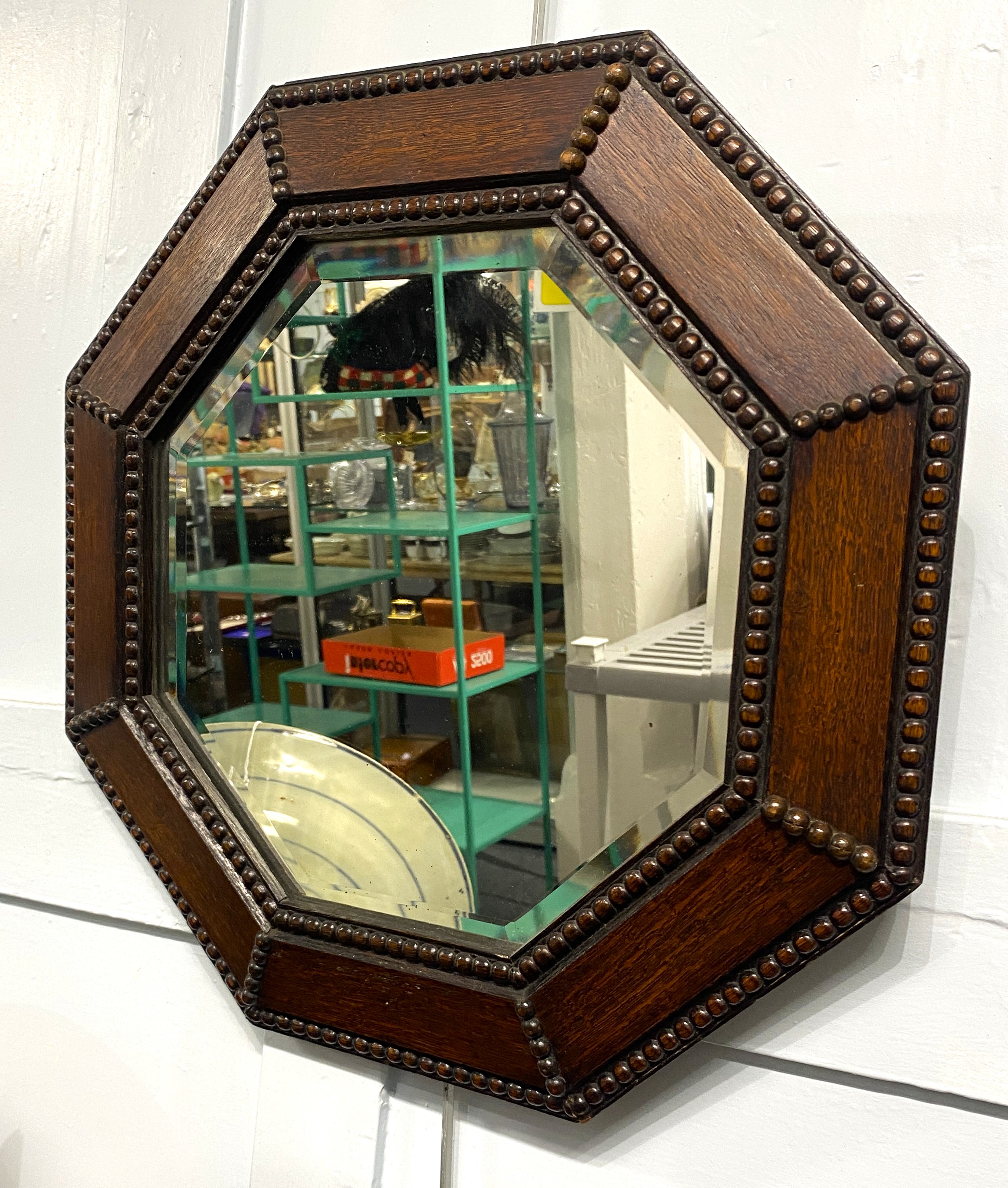 A c.1920's Jacobean revival oak framed bevelled wall mirror, of octagonal form with beaded decoratiom, 44cm.