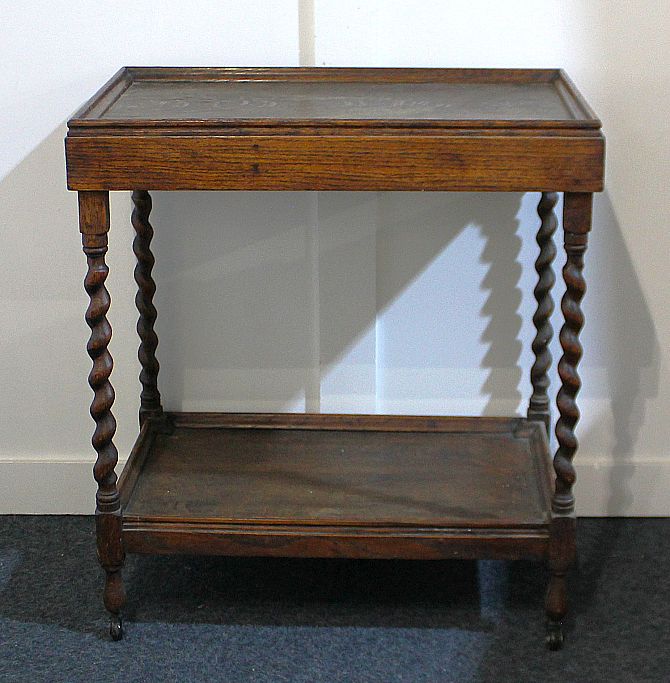 A vintage oak two tier drinks / serving trolley, c.1920's/40's. with barley twist uprights and casters,m 69cm wide by 46cm deep by 75cm high.