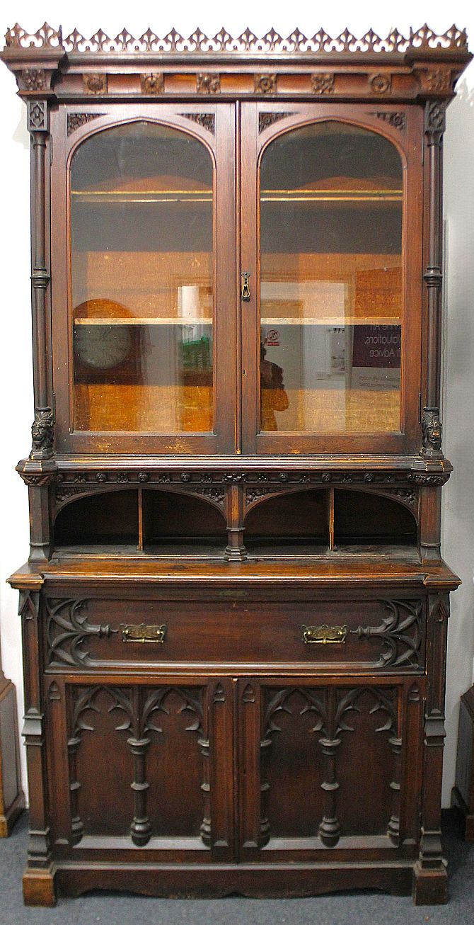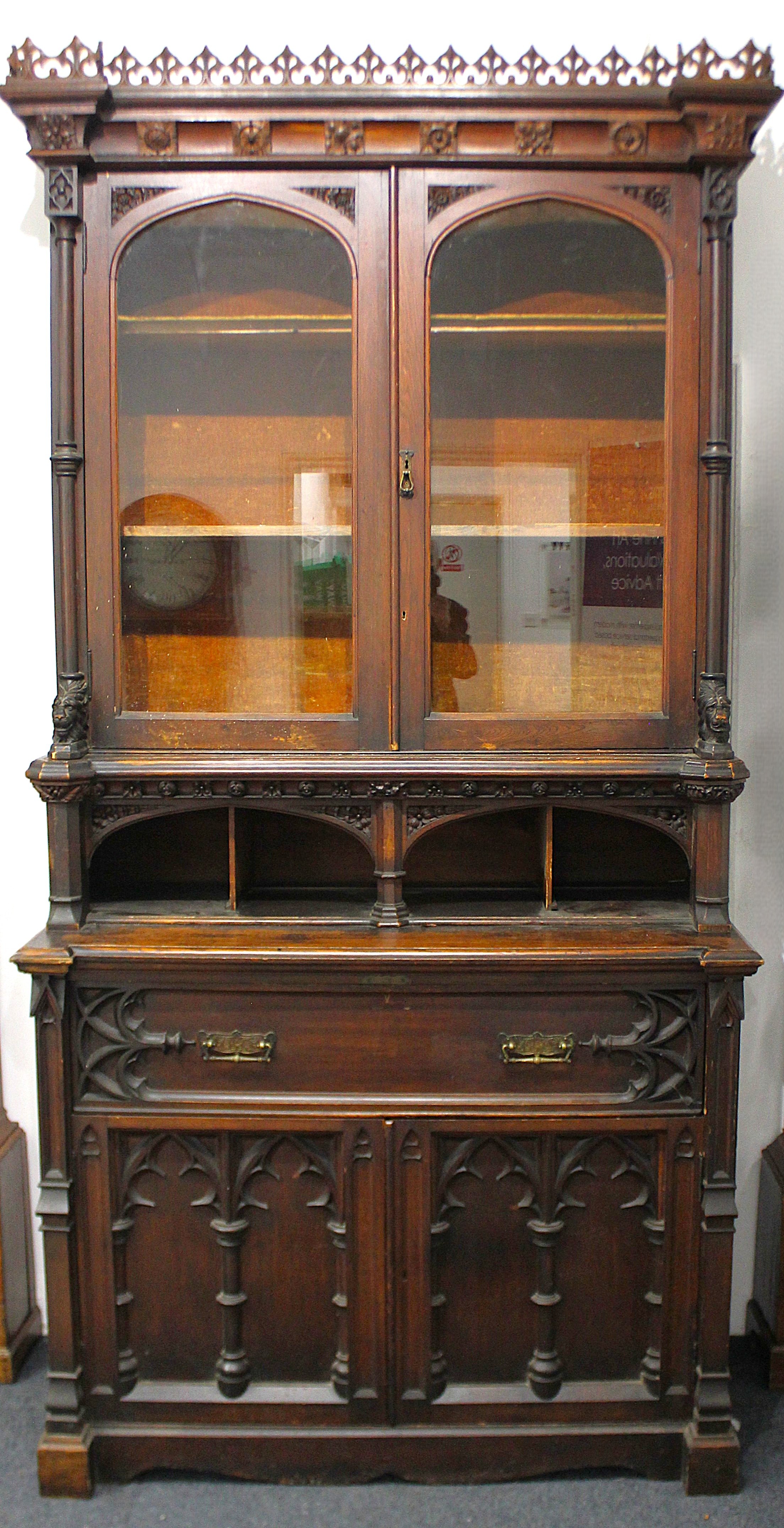 A 19th century Gothic revival oak reverse breakfront secretaire bookcase with carved decoration, the pierced trellis top above two arched glass panelled doors enclosing shelves, above arcaded recesses and a fitted secretaire drawer with two panelled cupboard doors beneath, 133cm wide by 266cm high, (constructed in two parts for ease of transport).
