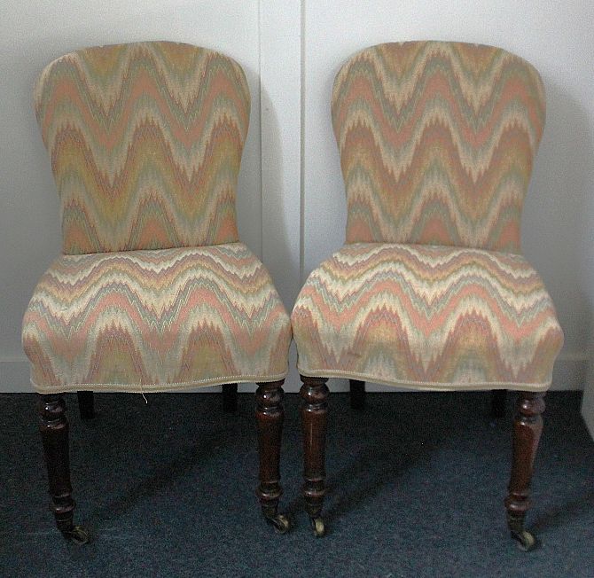 A pair of Victorian spoon back occasional chairs, re-upholstered in flame-stitch fabric, on turned legs to brass castors
