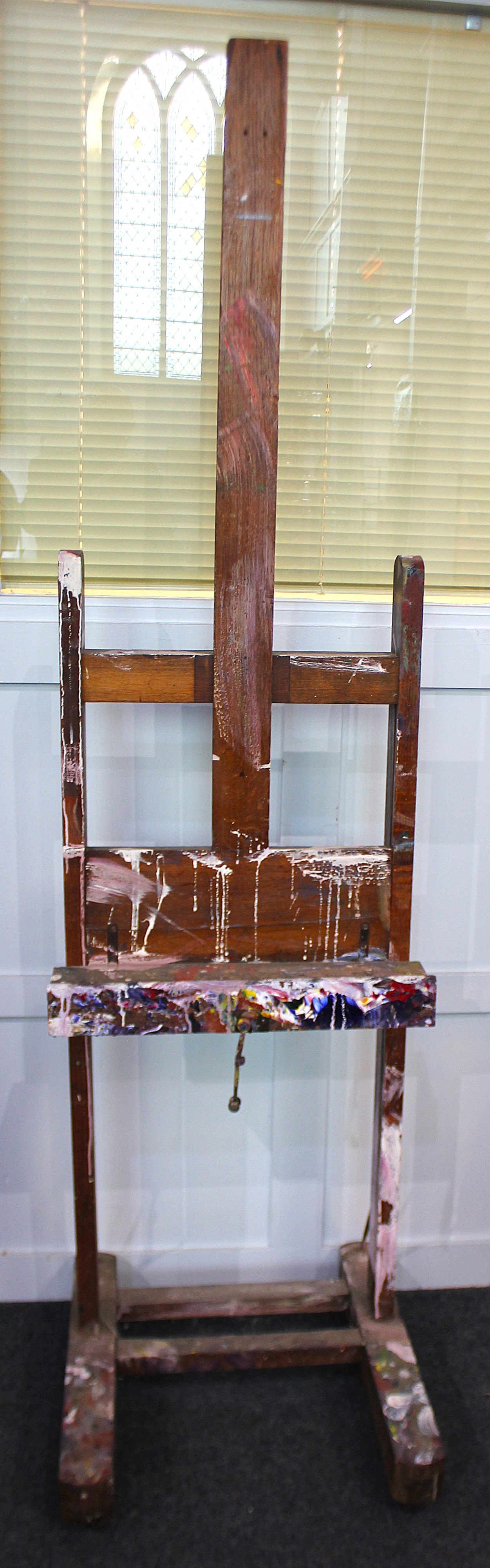 An oak artists studio easal, late 19th / early 20th century, height adjustable wind action, paint splattered, 207cm high by 54cm wide.,