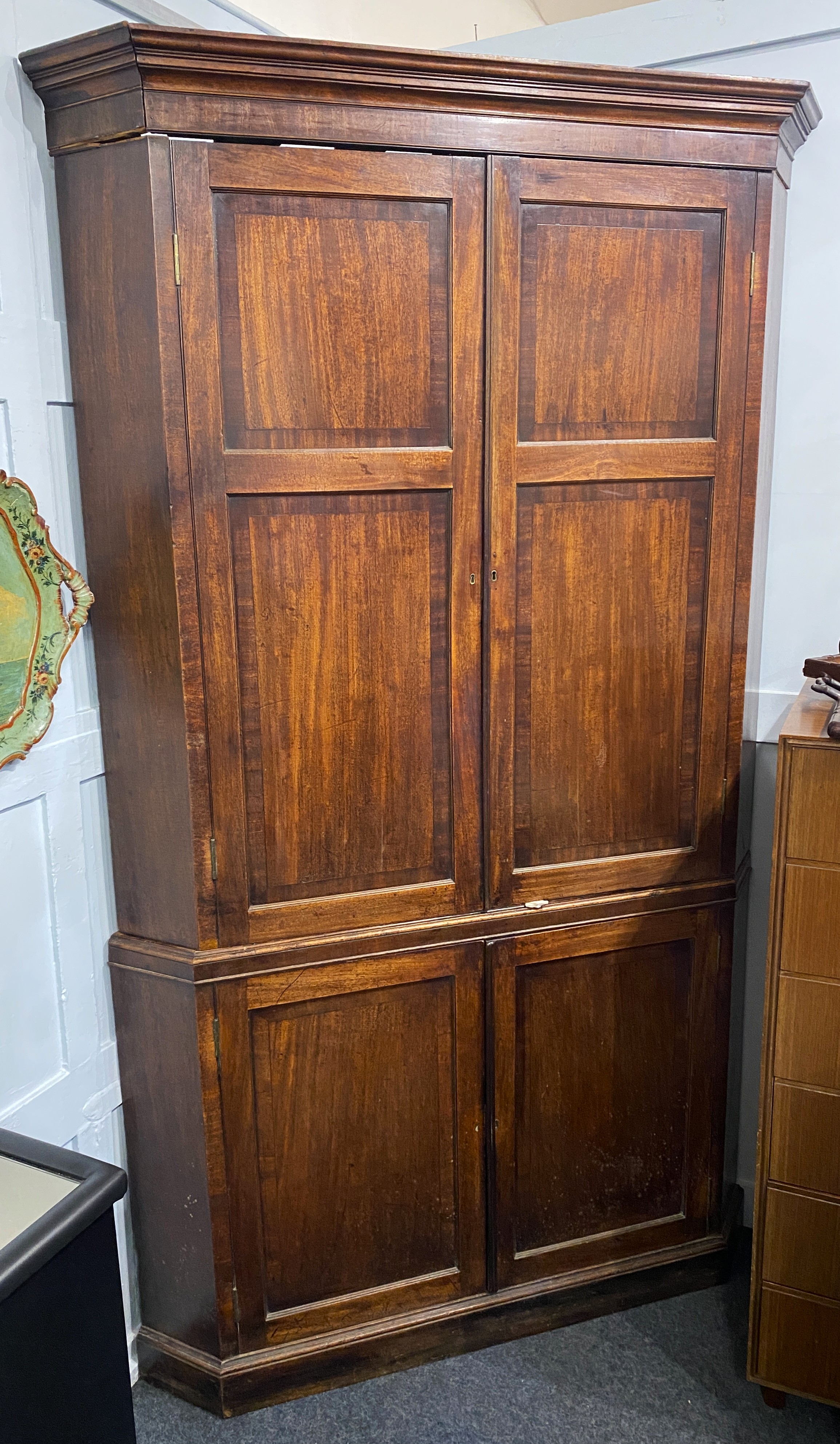 A large 19th century mahogany two section corner cupboard, the top section with two panel doors enclosing three shelves, the lower section with two panel doors enclosing shelf, on plinth base, height approx 209cm, width 119cm