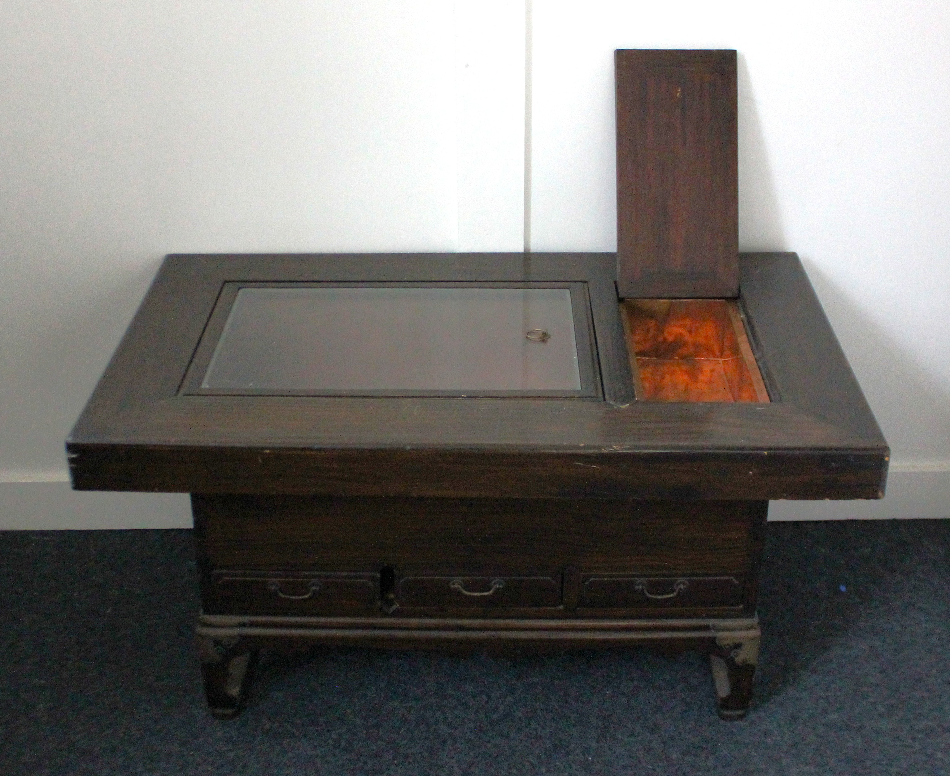 A Japanese copper mounted fruitwood home 'Hibachi' type table, 90cm by 54cm, by 48cm high.