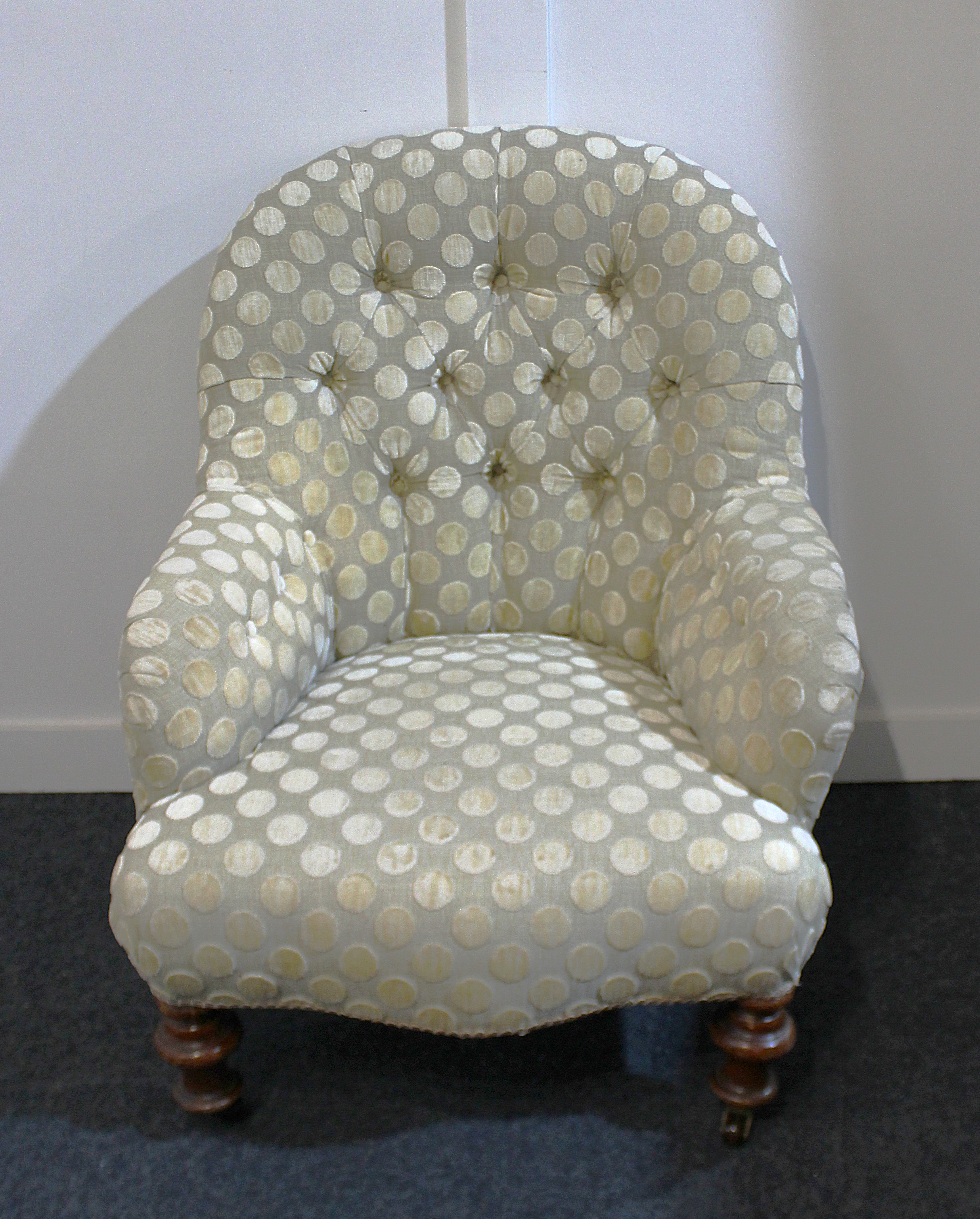 A Victorian buttoned back armchair re-upholstered in a contemporary fabric.