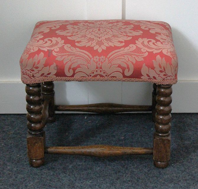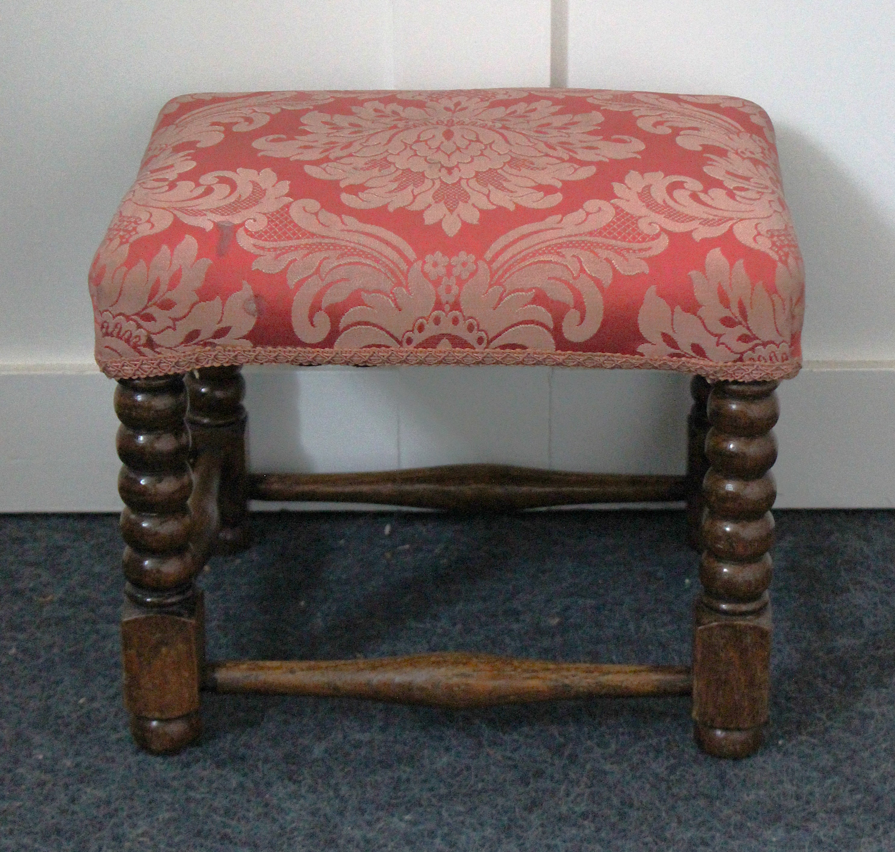 A small oak framed rectangular stool, with upholstered top on bobbin turned legs with uniting stretcher