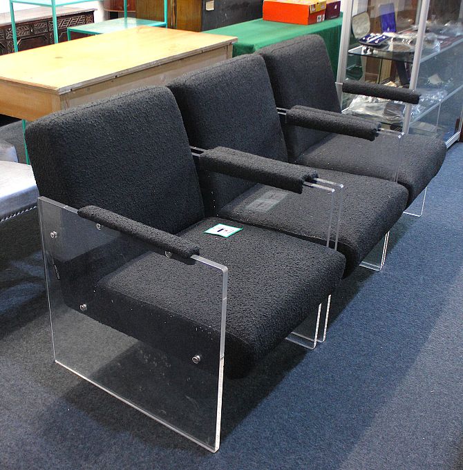 A set of three contemporary transparent acrylic / lucite armchairs upholstered in grey boucle fabric with upholstered arms, each being 60cm wide, (3).