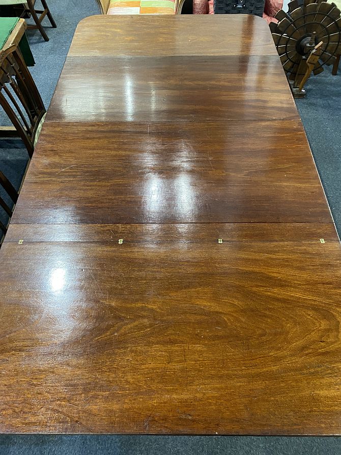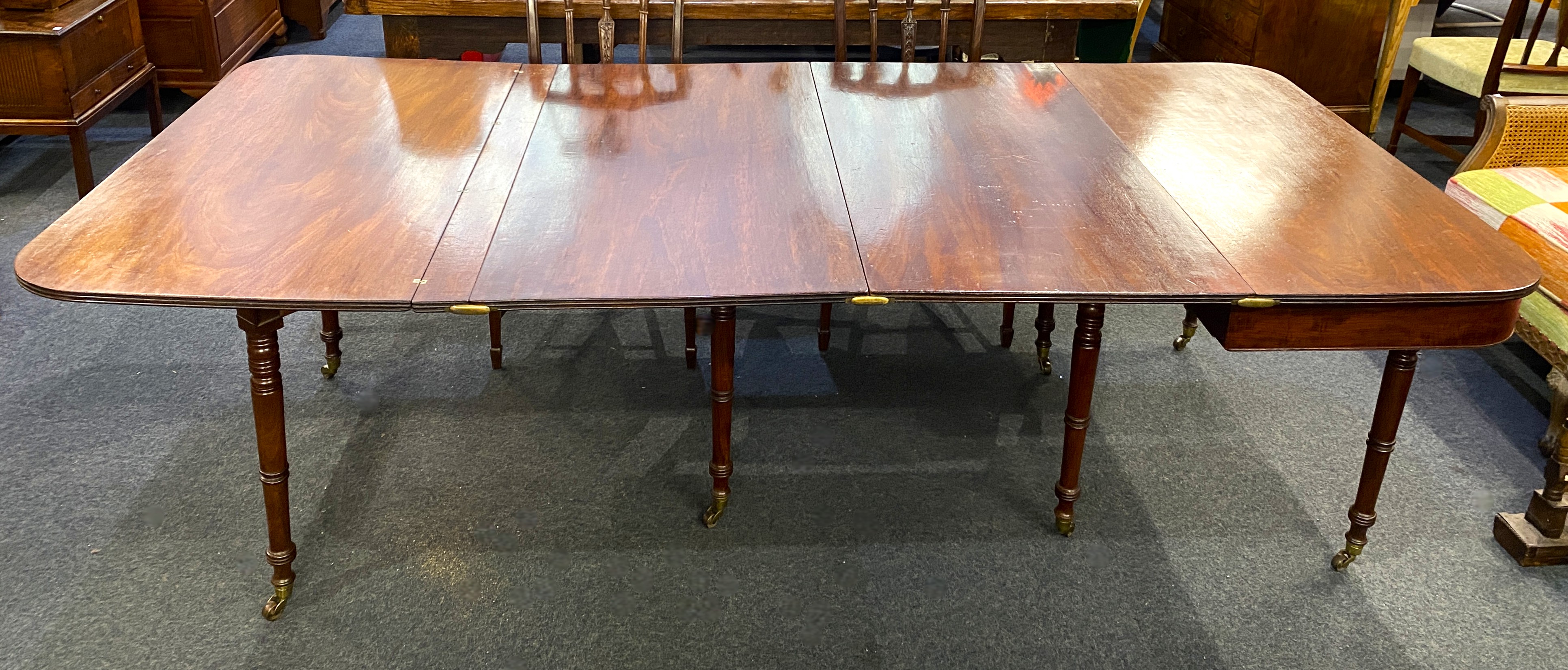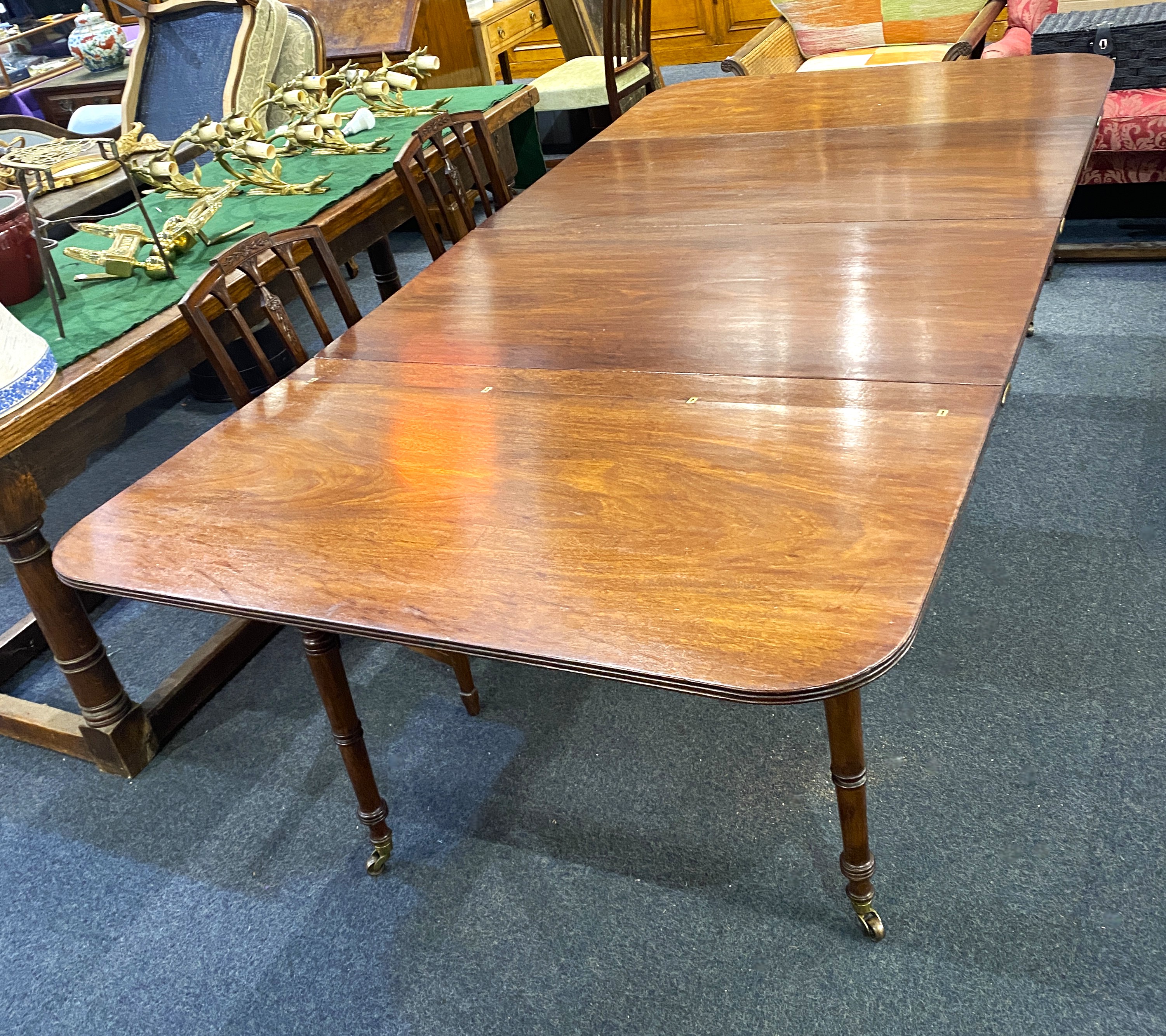 A 19th century mahogany extending dining table, the rectangular top with reeded edge and rounded corners, on seven turned legs and brass castors, with four additional leaves, the end sections with double gateleg supports, approx 286cm fully extended, height 72cm, depth 126cm, with brass clips