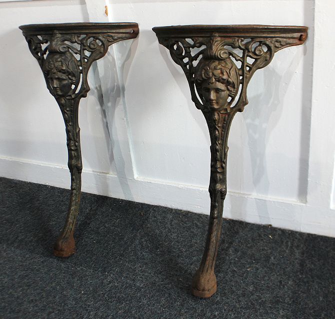 A pair of cast iron 'Britannia' style console table bases (no tops), each 40cm wide by 68cm high.