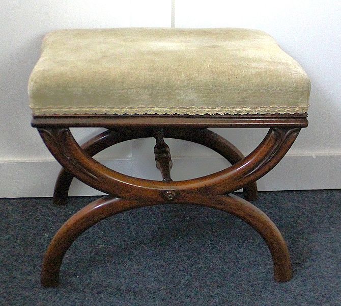 A Victorian X frame stool, the rectangular top with green upholstery, on 'X' frame supports united by a turned stretcher