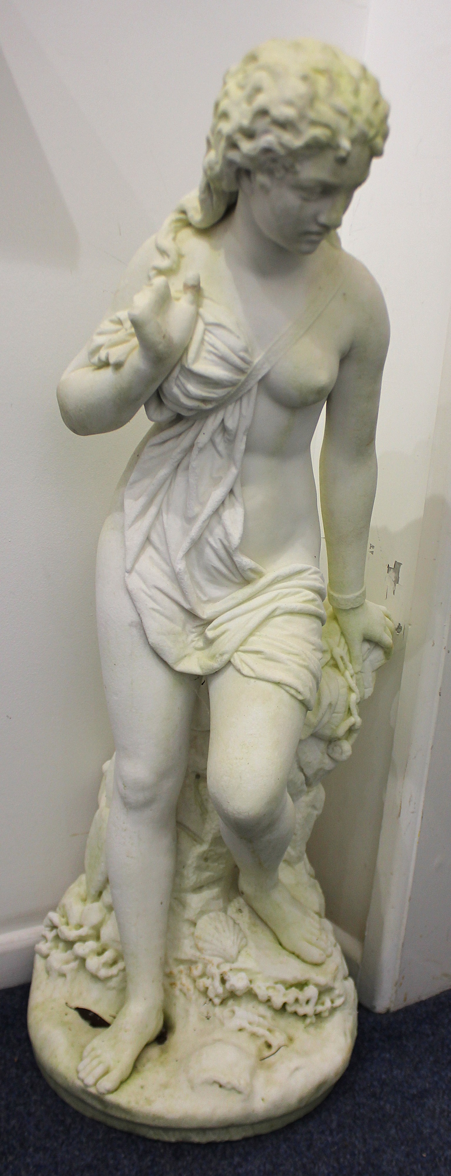 A 20th century classical revival stone garden statue depicting a classical maiden (af), 105cm high