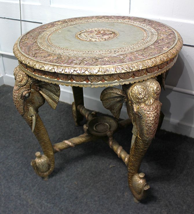 An Indian style circular side table in a silvered finish, 20th century, raised on elephant supports, 70cm diameter by 65cm high.