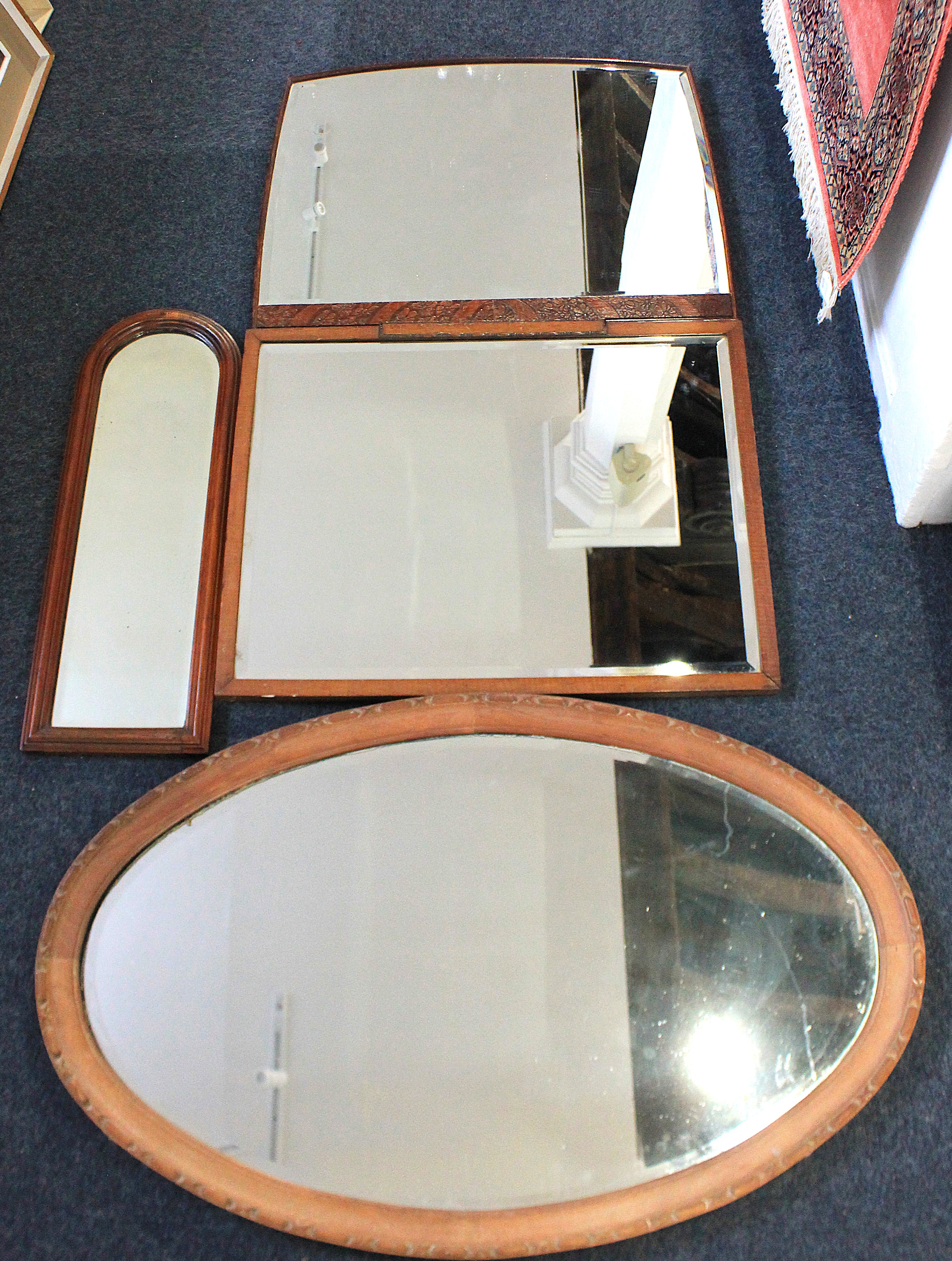Four vintage bevelled wall mirrors in wooden frames, early / mid 20th century, 100cm, 70cm, 65cm, and 24cm wide.