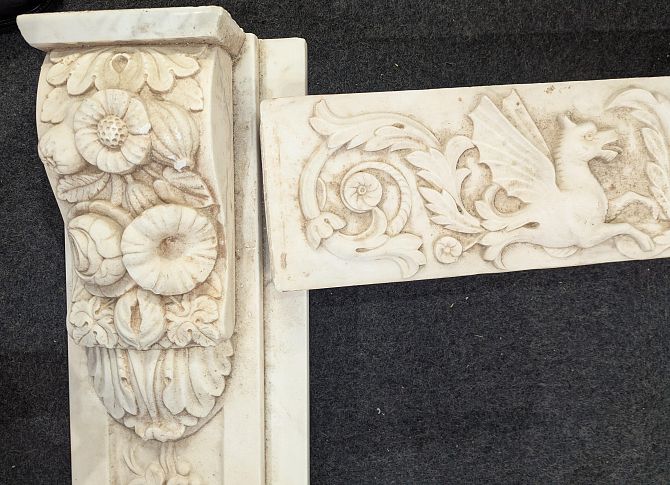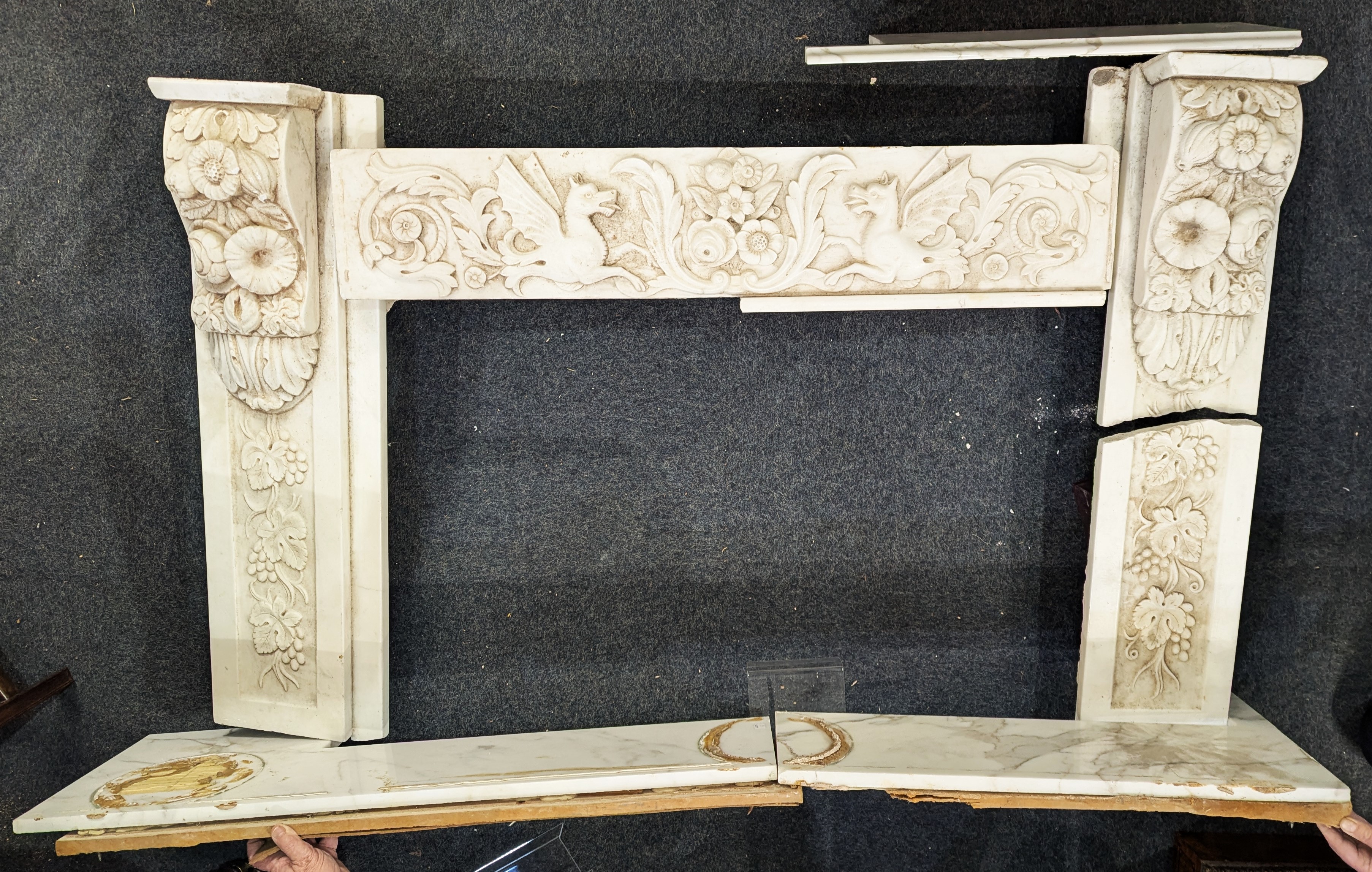 A good quality carved white marble fire surround in the Old Country House manner, in sections, comprising central frieze with a pair of wyvern amongst scrolling flowers and foliage, and a pair of carved uprights carved with flowers, foliage and fruiting vines, together with associated marble sections for hearth and top, central frieze 109.5cm by 20cm, uprights each 98cm high, 28cm high (a/f - damage to some sections, and some parts missing)