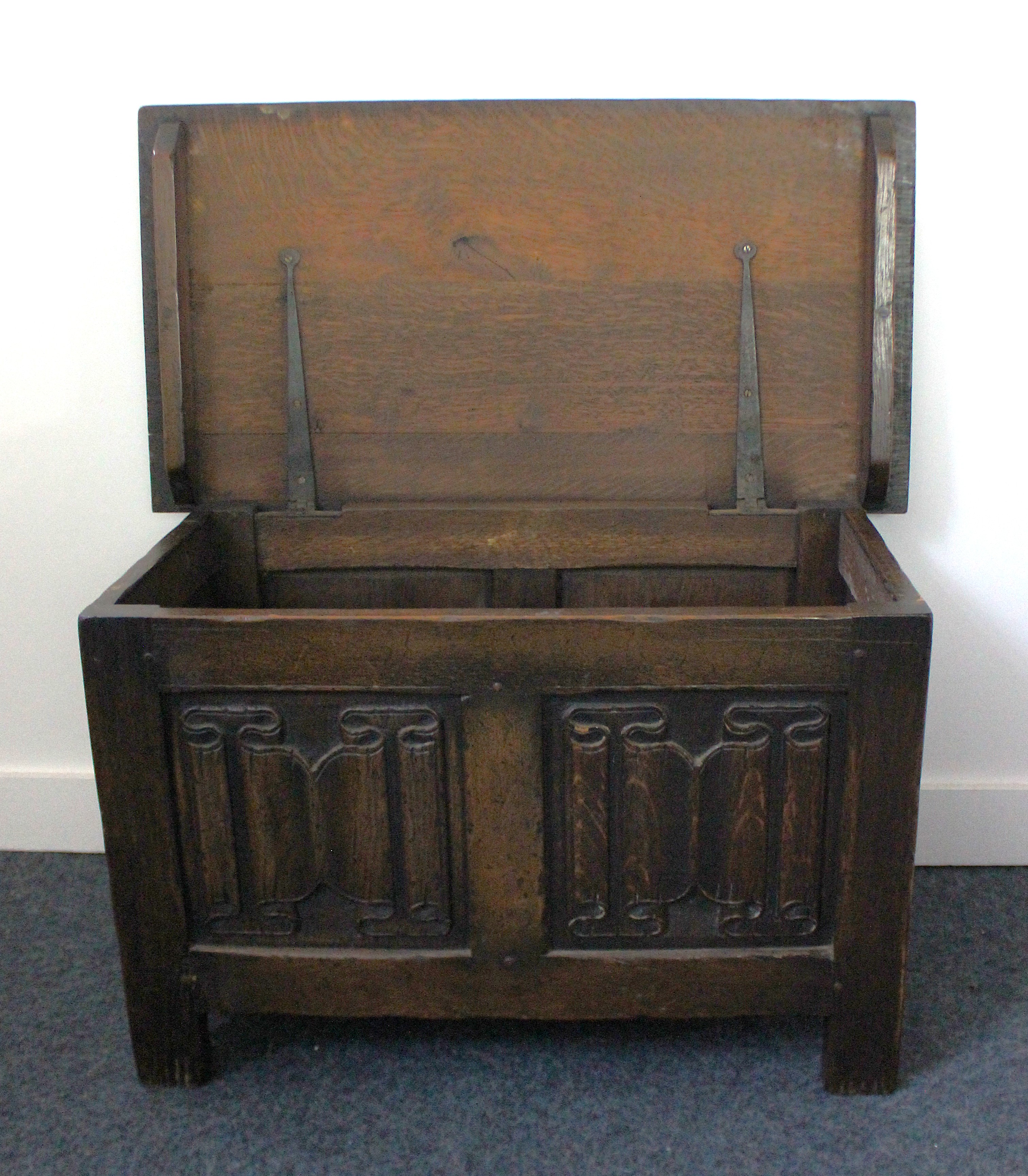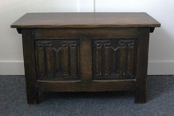 A vintage oak coffer of small proportions, in a 17th century style, 20th century, with hinged lid above linenfold panels, raised on stile feet, 76cm wide by 45cm high by 40cm deep.