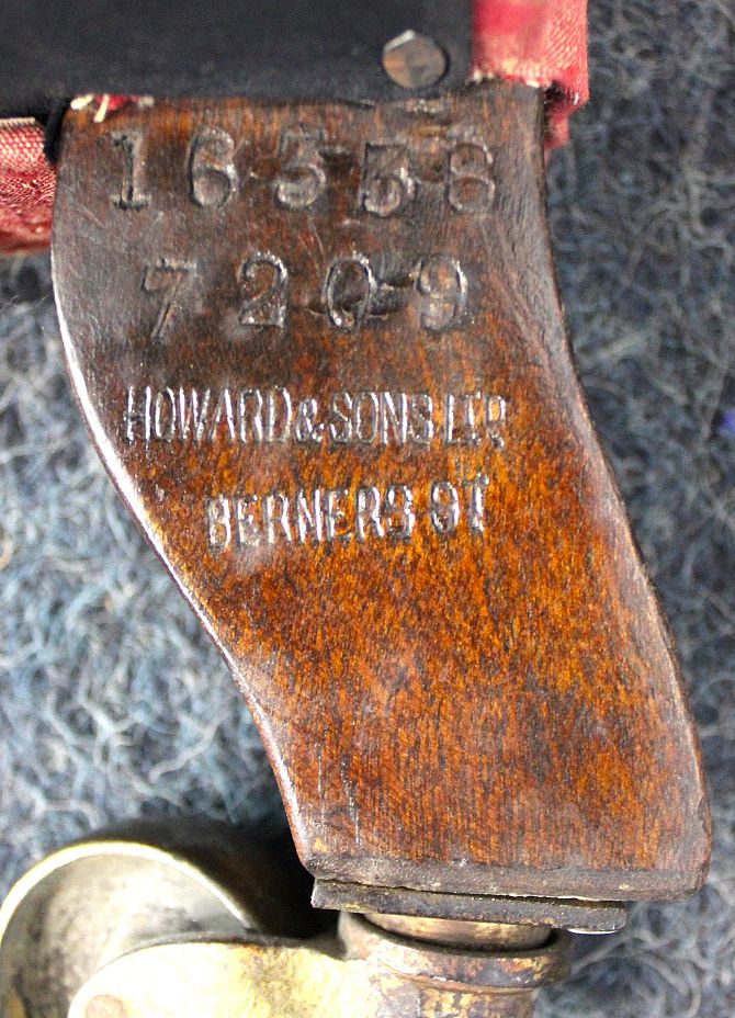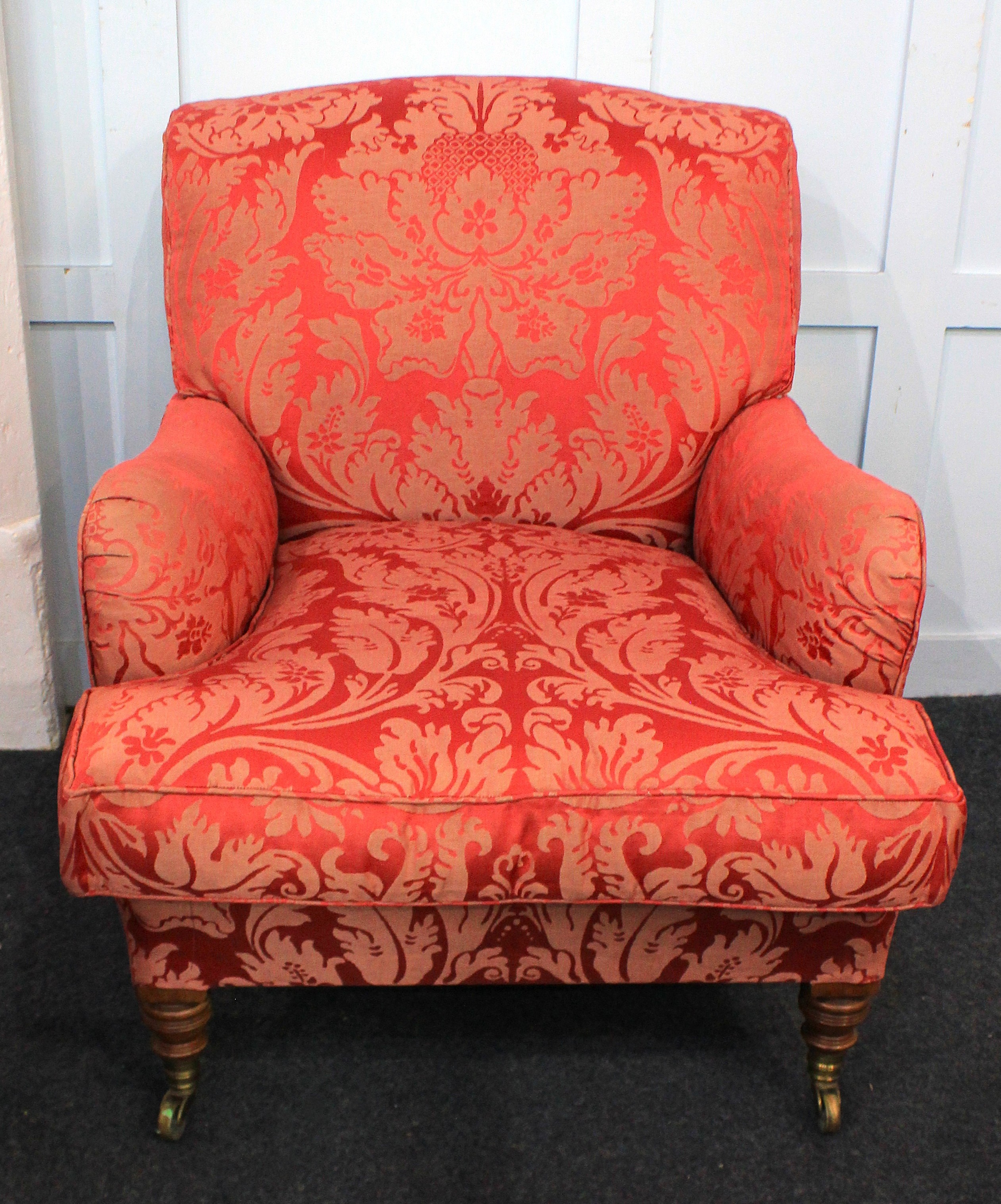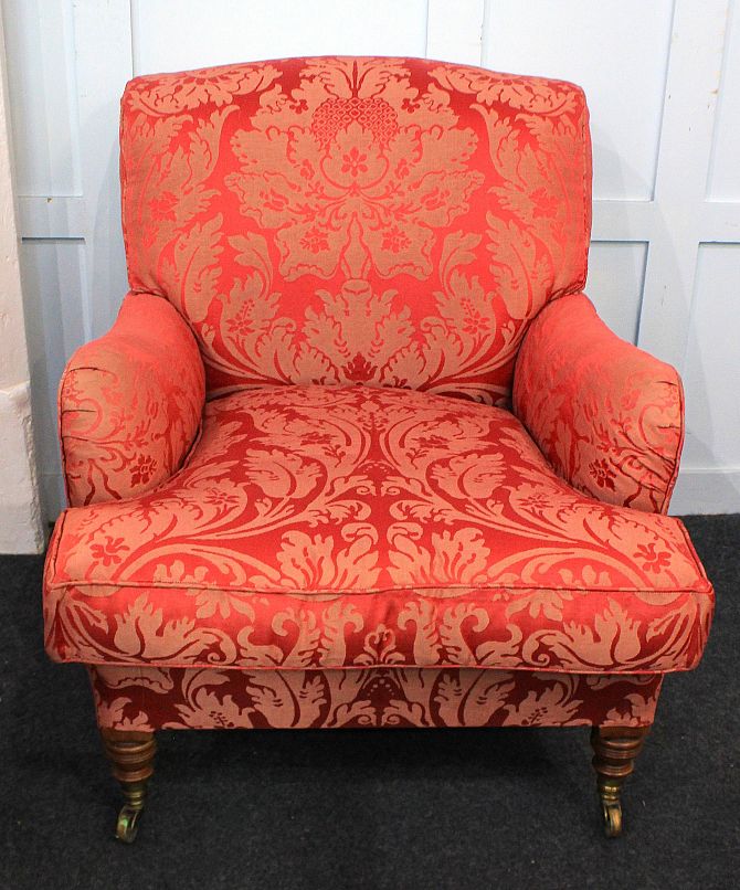 A Victorian Howard & Sons armchair, with later upholstery, on turned front legs and back splayed legs with brass castors, back leg stamped '16558 7209 Howard & Sons Ltd Berners St'
