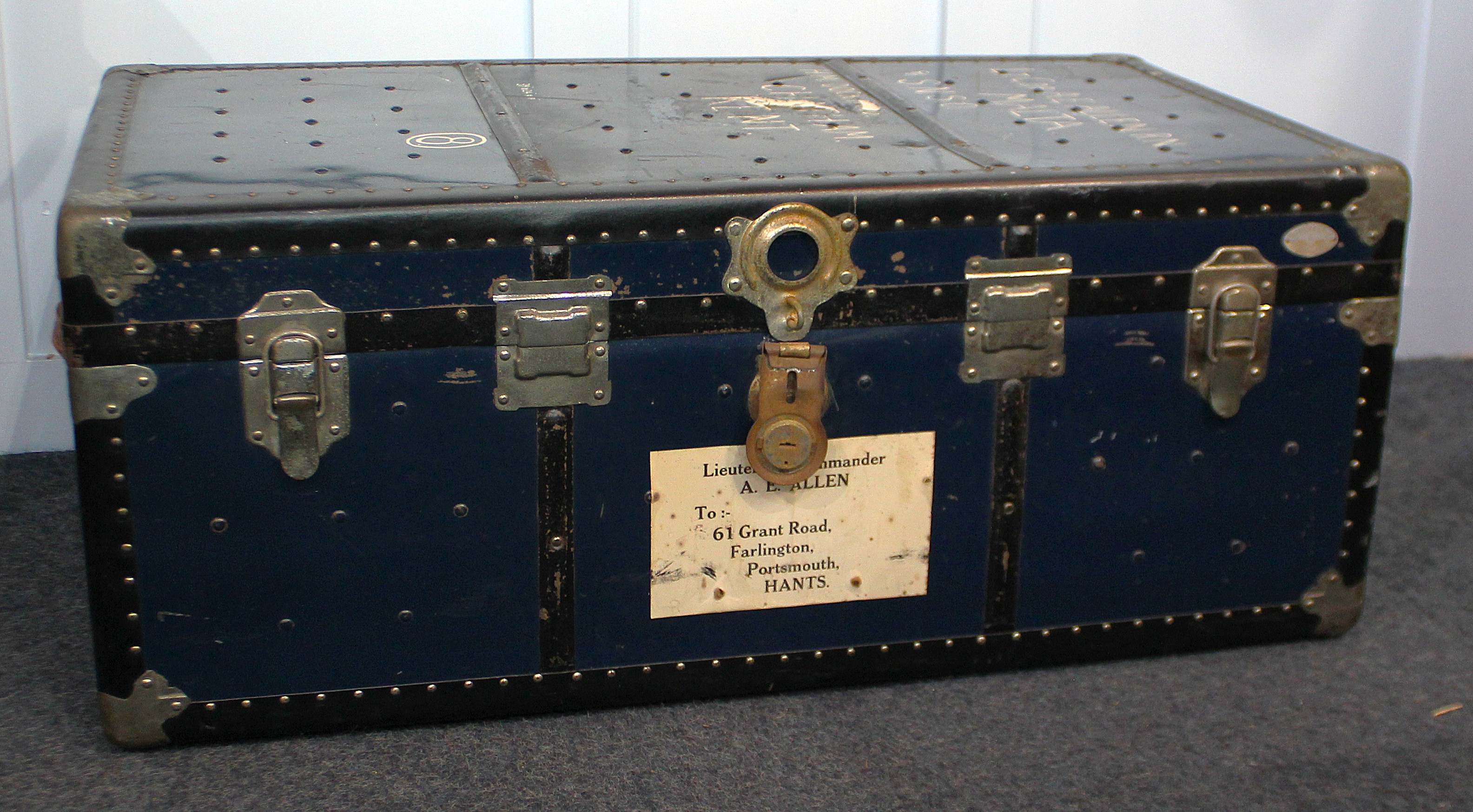 Lieutenant Commander A E Allen, Royal Navy, a metal bound blue travelling trunk, with labels and inscriptions to the top, height 38cm, width 96cm, depth 54cm