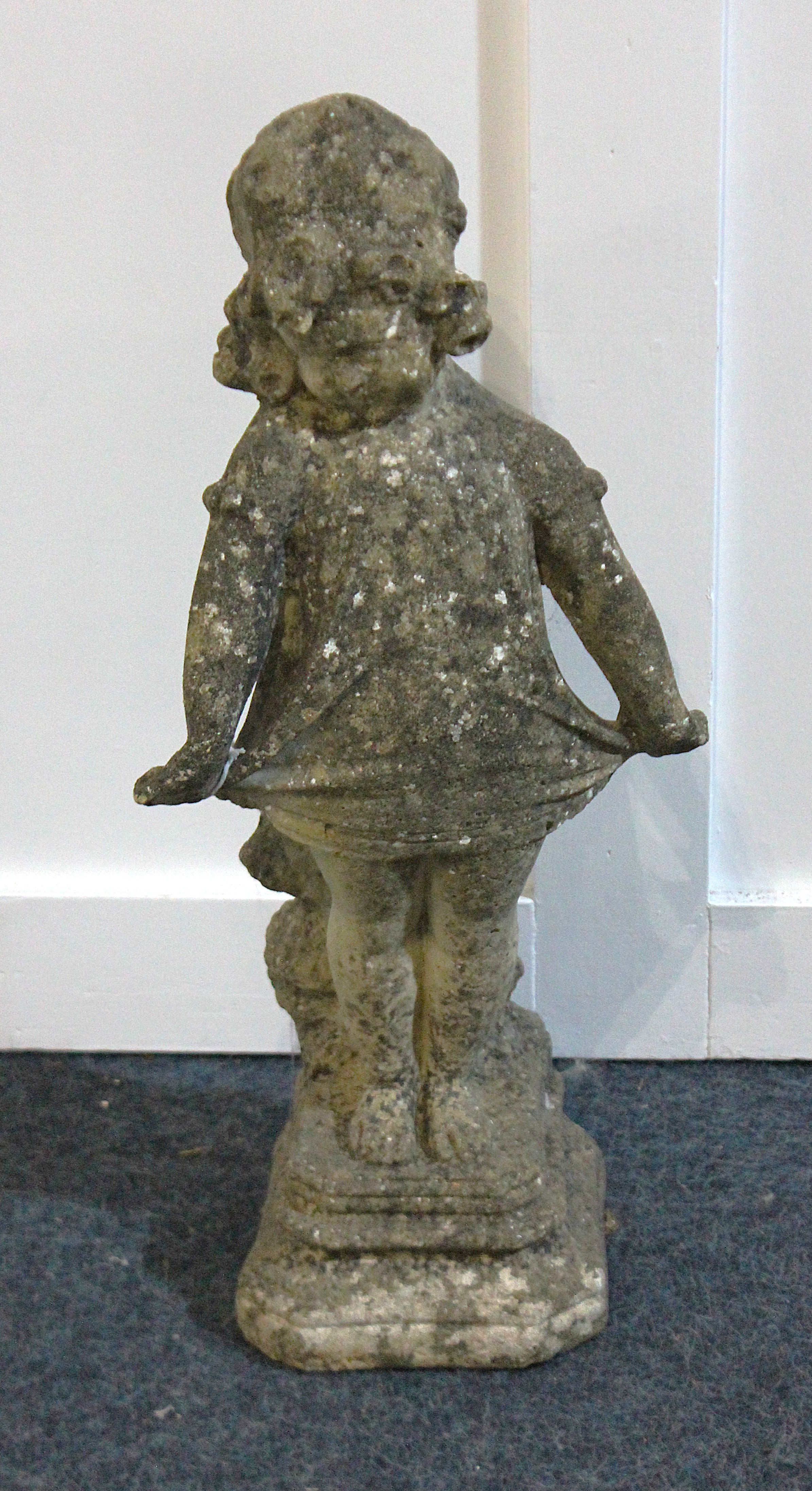 A weathered and patinated reconstituted stone garden statue depicting a girl, 62cm high.