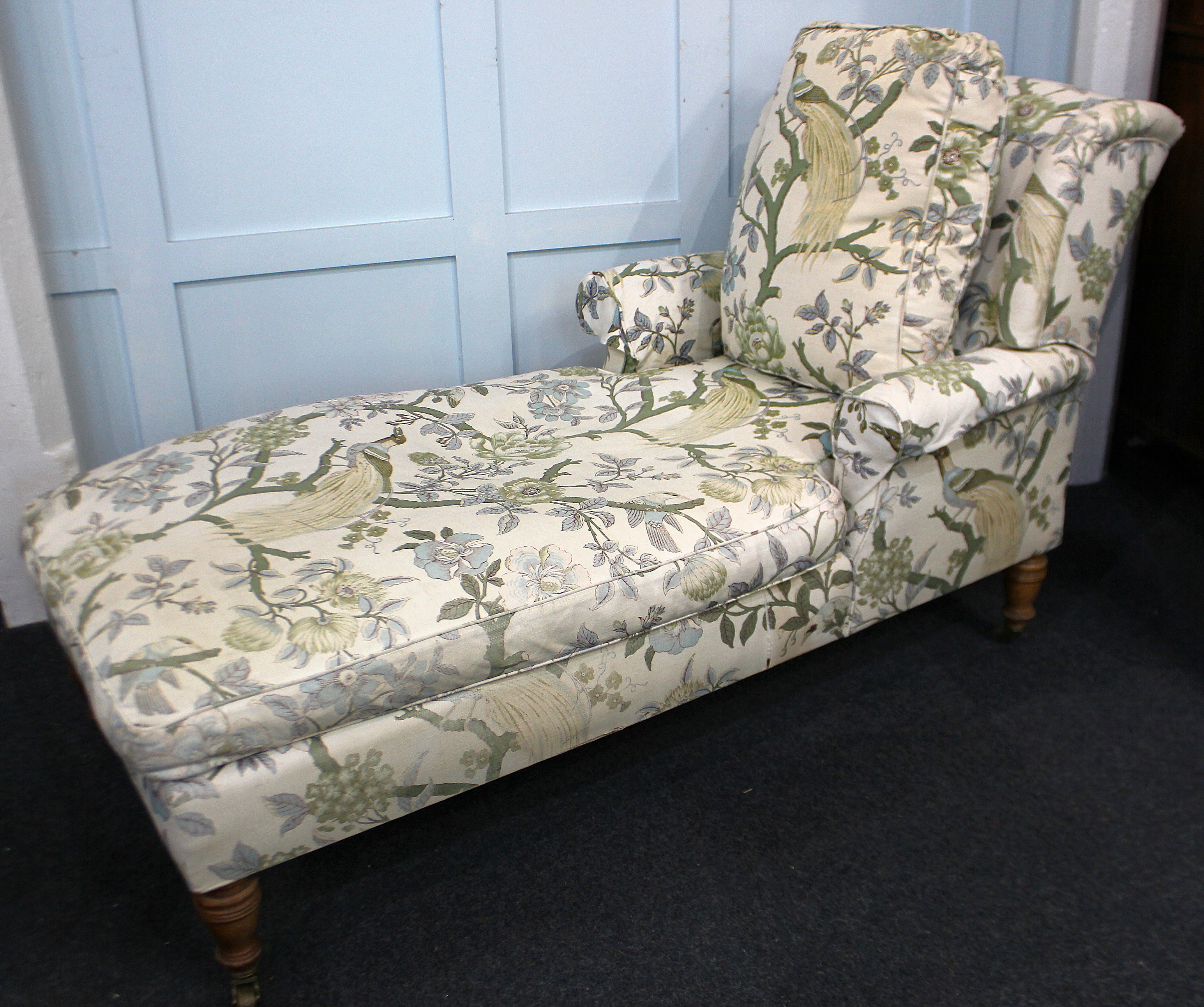 In the manner of Howard & Sons, a reclining day bed of long form, later upholstered in pale patterned fabric decorated with exotic birds amongst flowering branches, one turned leg stamped '10042 1643', on unmarked brass castors