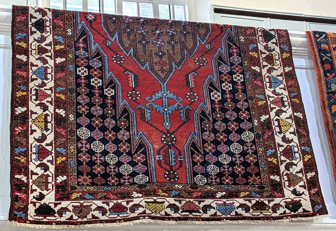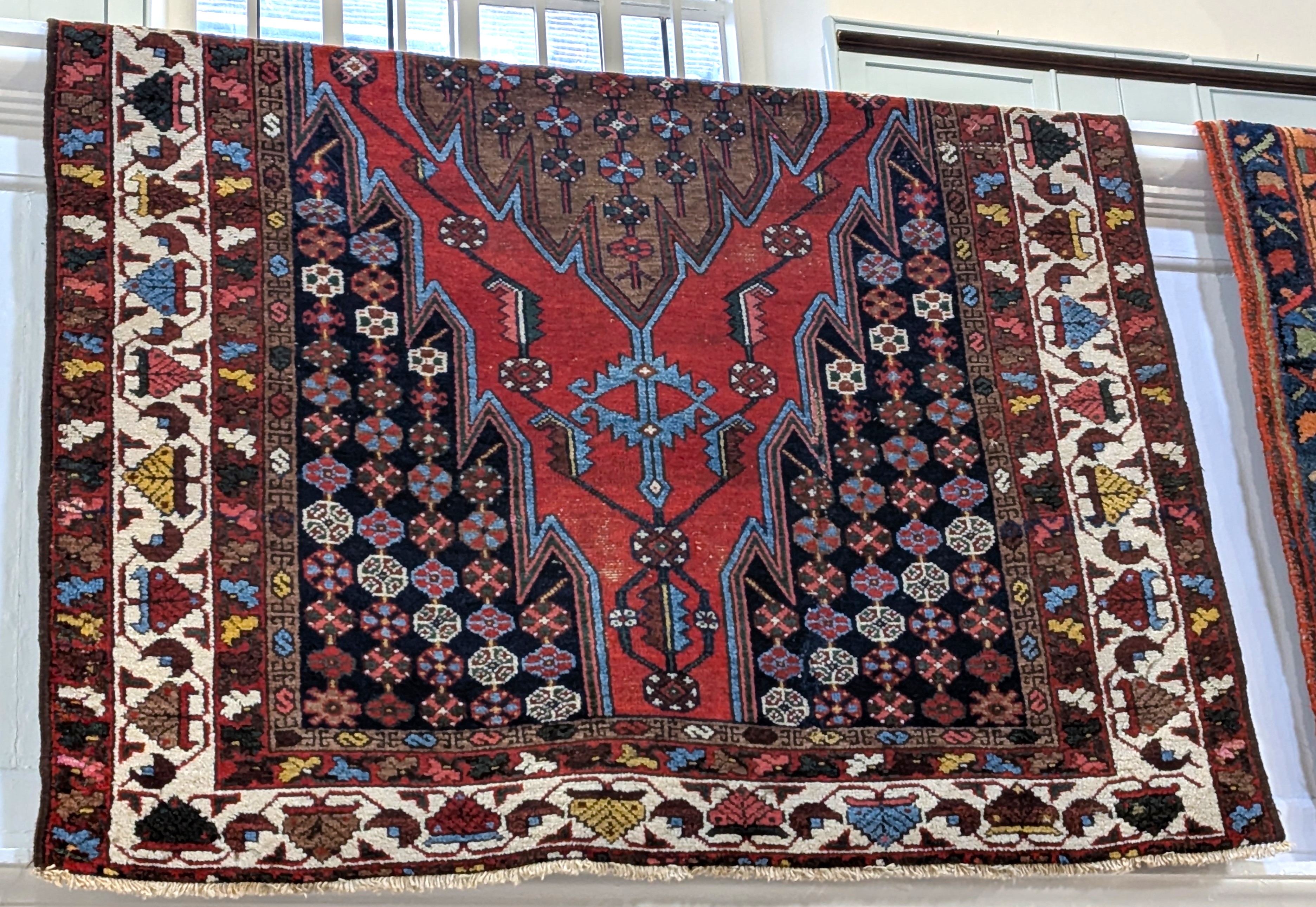 A Hamadan design rug, red ground with central stepped medallion containing stylised floral and geometric motifs, approx 126cm by 196cm