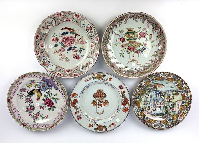 A collection of five various Chinese porcelain plates to include three famille rose examples largest 23cm diameter (a/f)