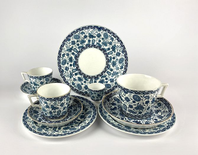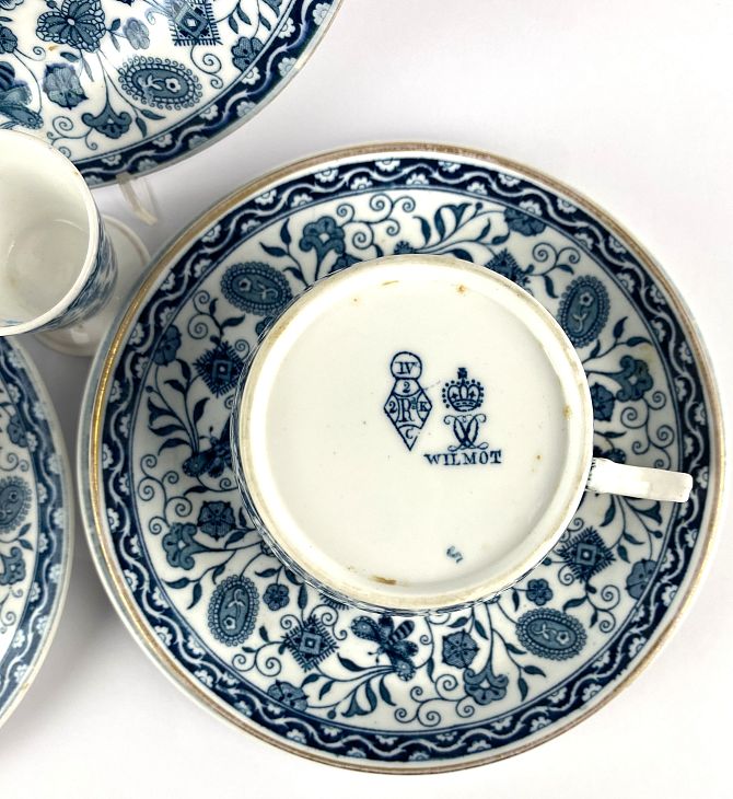 A Royal Crown Derby 'Wilmot' pattern part tea service, comprising; three tea cups and saucers (one larger), three side plates (one AF) and an egg cup, the majority bearing diamond Registration marks (10)