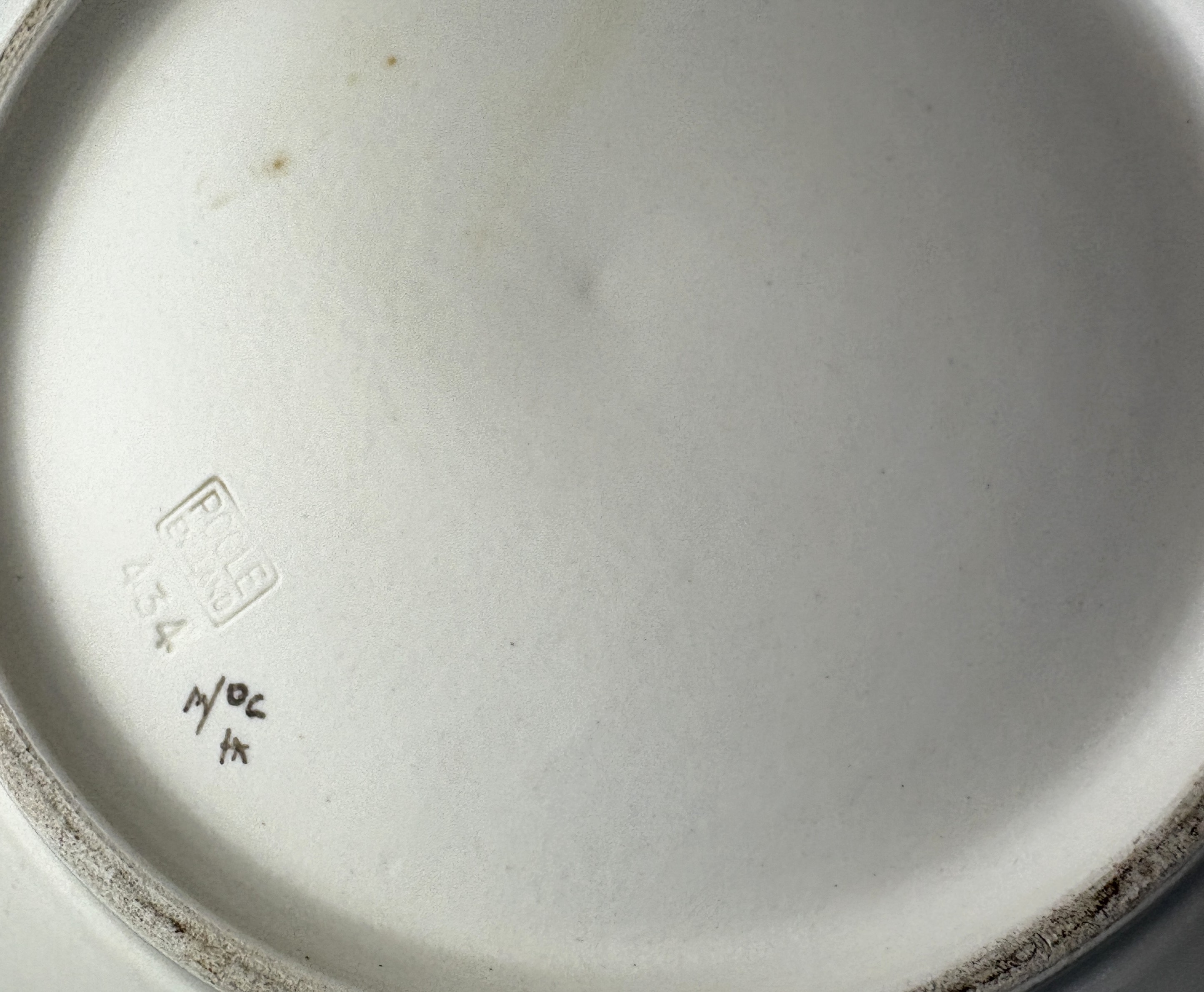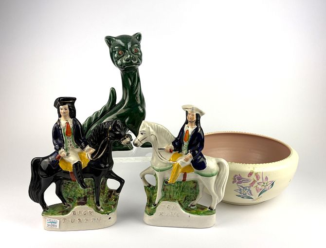 An Aller Vale Devon green glazed pottery model cat (eyes lacking) 23cm high, a Poole Pottery bowl painted with floral sprigs, bearing impressed mark to base and inscribed number, diameter 25cm, and a pair of Staffordshire pottery figures of Dick Turpin and Tom King (4) (a/f)