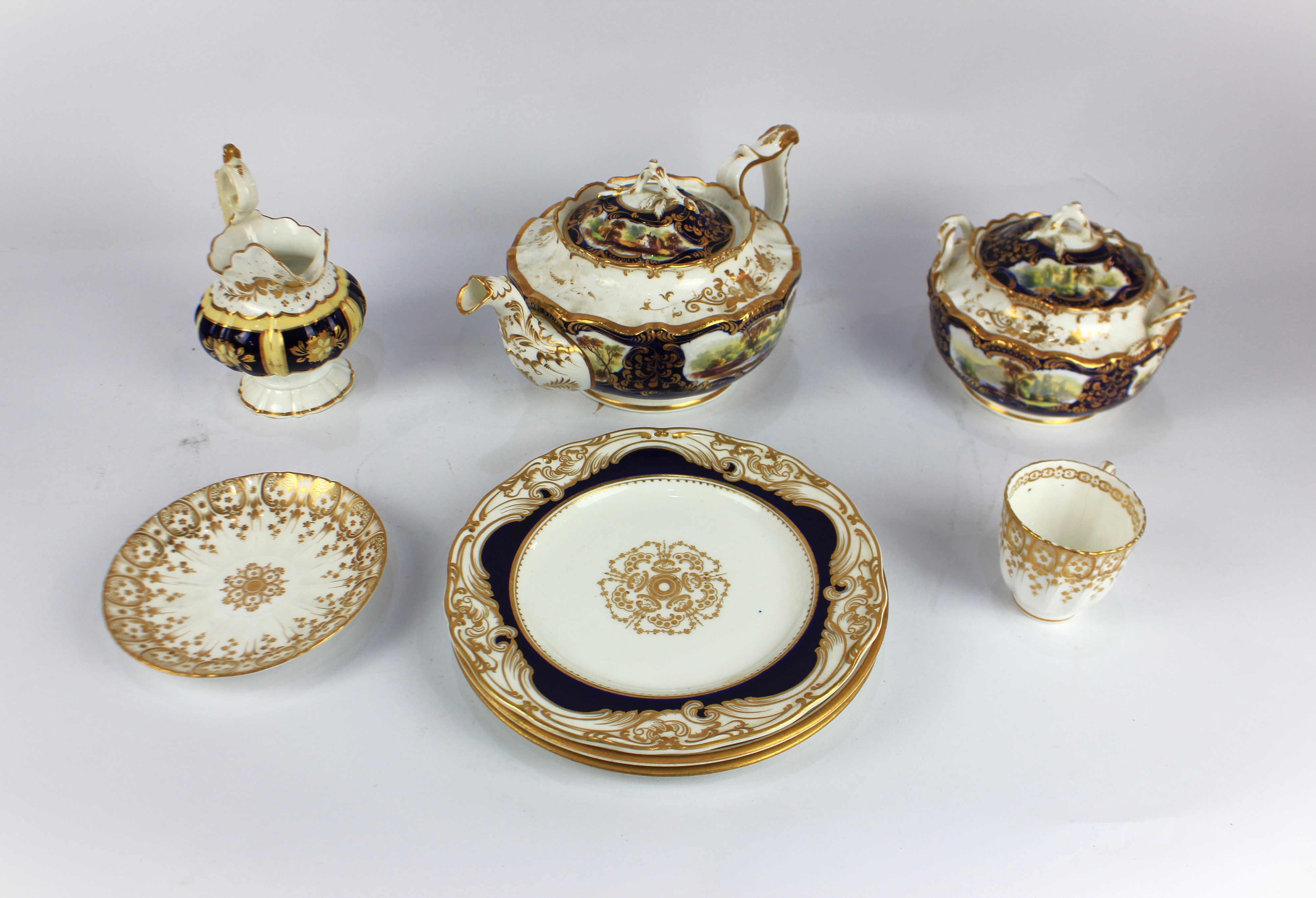 A 19th century teapot and covered sucrier, in the manner of Coalport, each decorated against the white ground with cobalt blue, gilt heightened and with gilt floral sprays, handpainted with landscape scenes, together with an unmarked milk jug, with cobalt panels decorated with gilt, a Davenport plate, gilt decorated, a pair of Davenport sideplates, white ground with cobalt and gilt decorated rim and an unmarked teacup and saucer, decorated against the white ground with gilt leaf pattern, jug height 15cm (8) (AF)