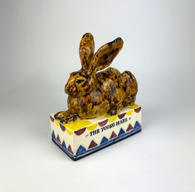David Cleverly, 'The Young Hare After Durer', a glazed earthenware sculpture of a hare, painted signature, 20cm high, 19cm long (ARR)