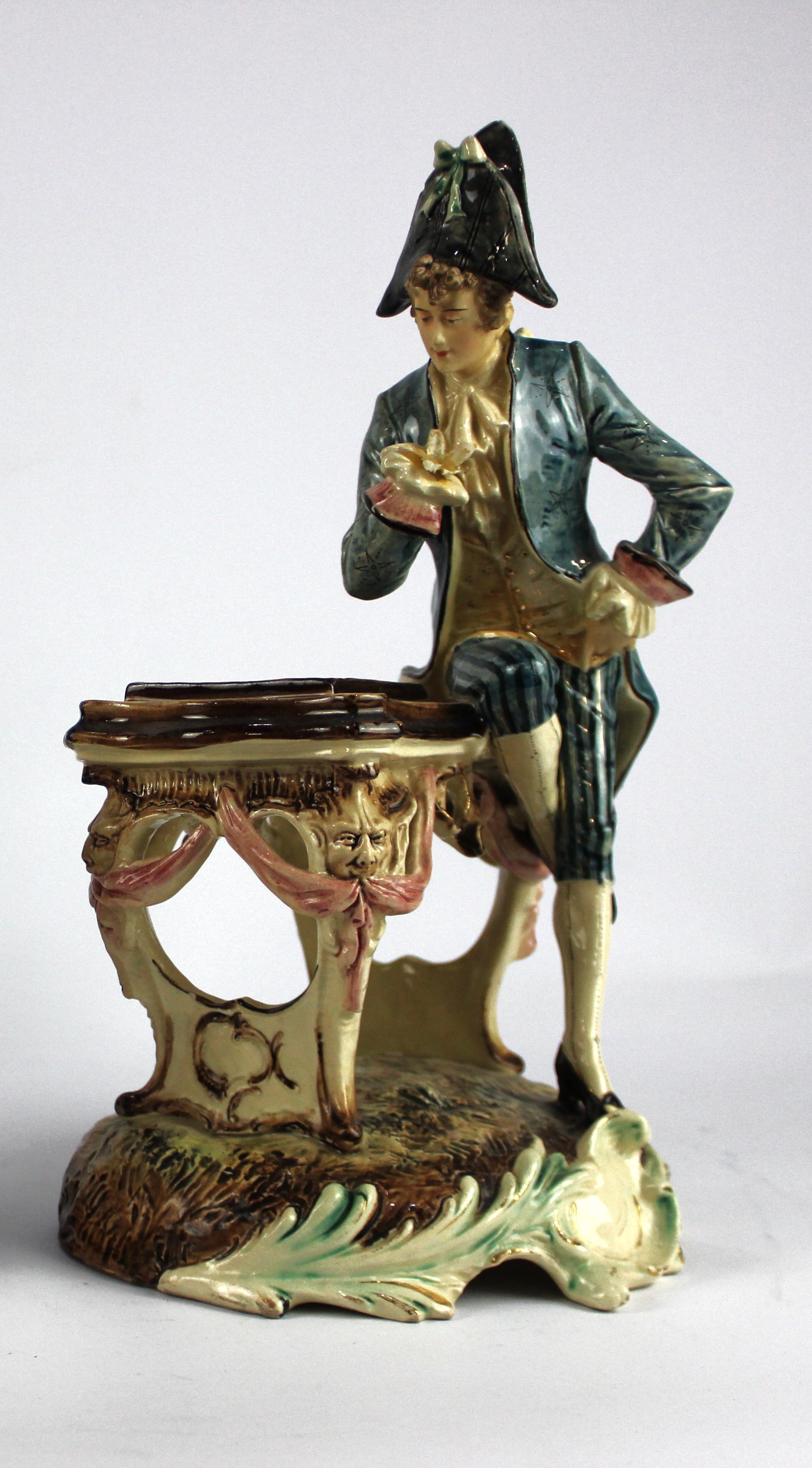 A pair of continental figures of chess players, modelled as a male and female figure in 18th century style French attire, impressed number to base (male figure AF), height 37cm (2)