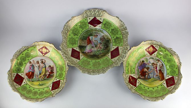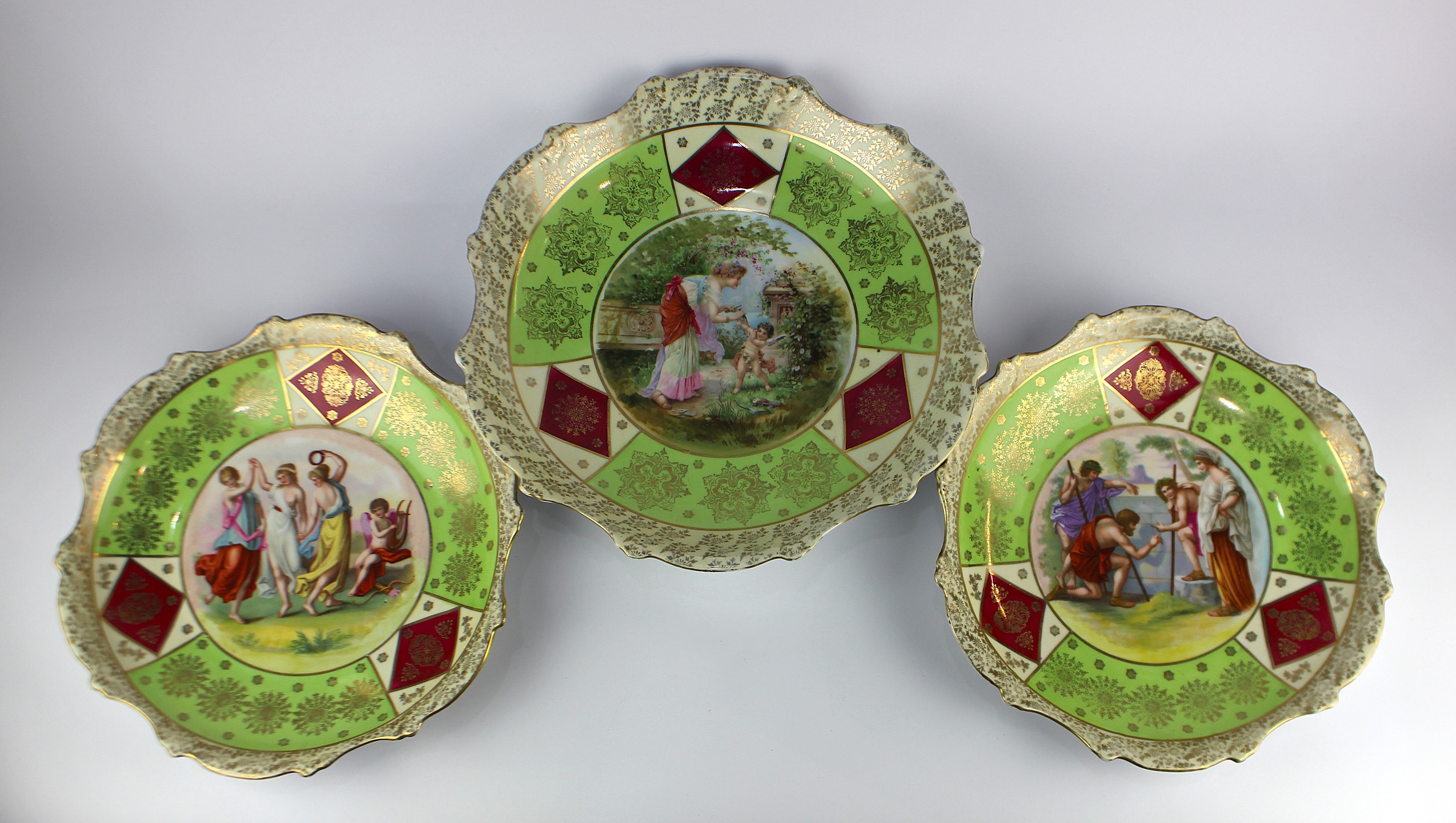 A pair of Victoria Altrohlau Vienna style porcelain chargers, 19th century, each with central classical scene, shaped rim, gilt decorated, together with a similar Victoria Altrohlau charger, with central scene of classical female figure and putto within a garden, all marked with a crown and 'Victoria', diameter 34cm (3)