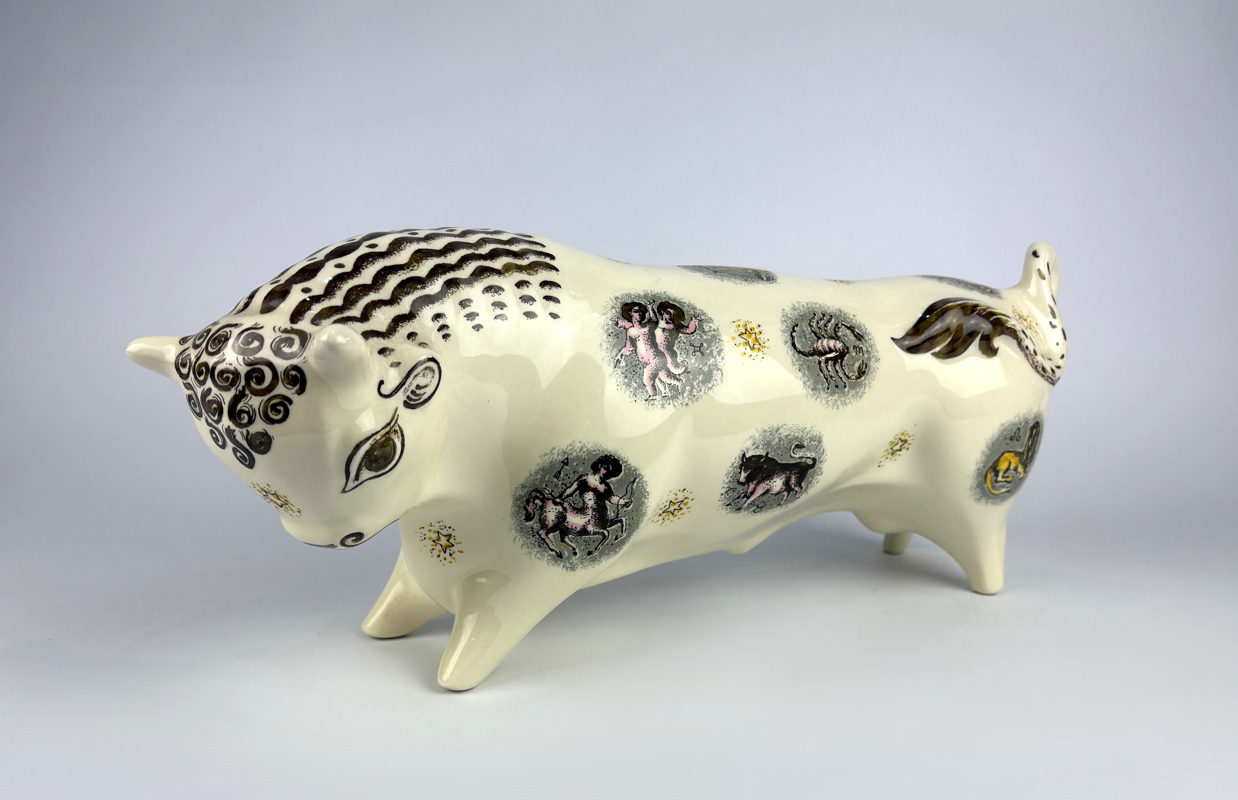 A Wedgwood Pottery Zodiac bull designed by Arnold Machin, designed in 1946, printed with star sign vignettes in colours, impressed marks, printed factory marks, 40cm long