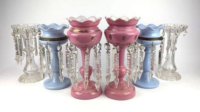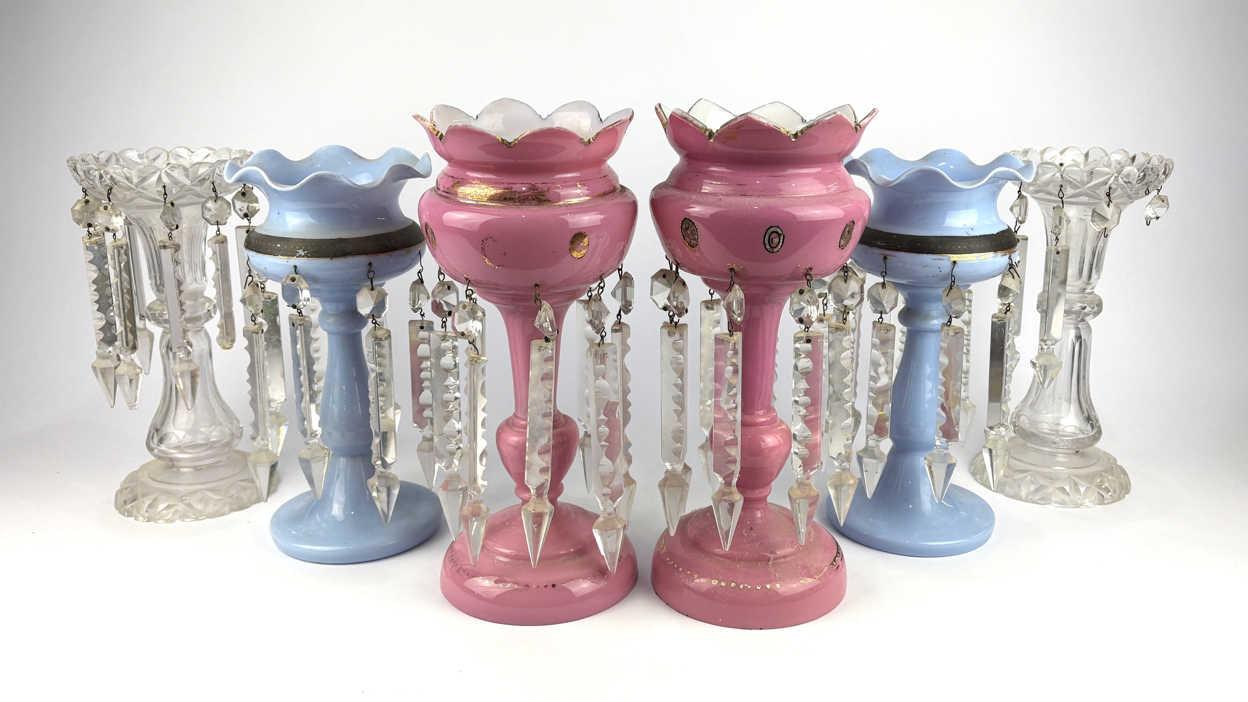 A pair of Victorian blue glass lustres, with wavy rim, gilt band decoration, height 27cm, together with a pair of clear glass lustres and a pair of pink glass lustres, height 31cm (3 pairs) (AF)