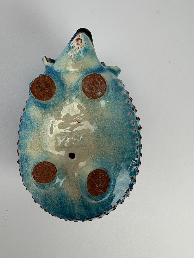 An Egyptian style glazed turquoise pottery model of a hedgehog, marked '3965' to base, 10.5cm long (a/f)