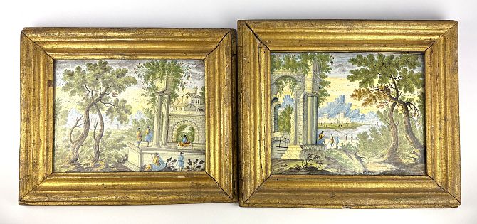 A matched pair of antique Castelli maiolica plaques, possibly 18th century, each hand painted in traditional colours depicting landscapes featuring ancient buildings and figures, each 21cm by 27cm, inset matching antique giltwood frames, (frames damaged).