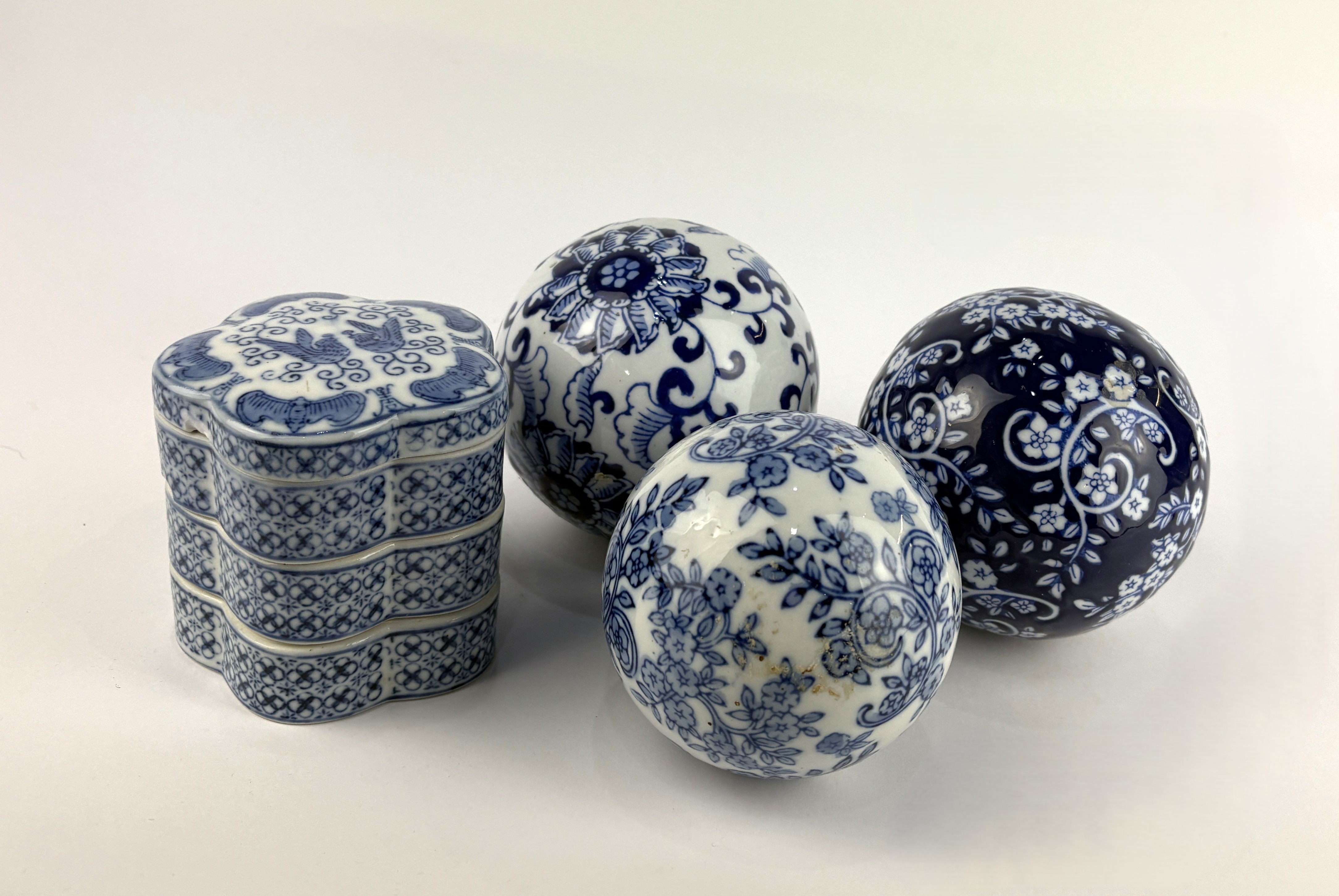 Three Chinese blue and white ceramic carpet balls, each decorated with flora swags, diameter 10cm ceramic balls and a Chinese blue and white ceramic stacking pot, the cover decorated with bat and bird motif, height overall 9cm (4)