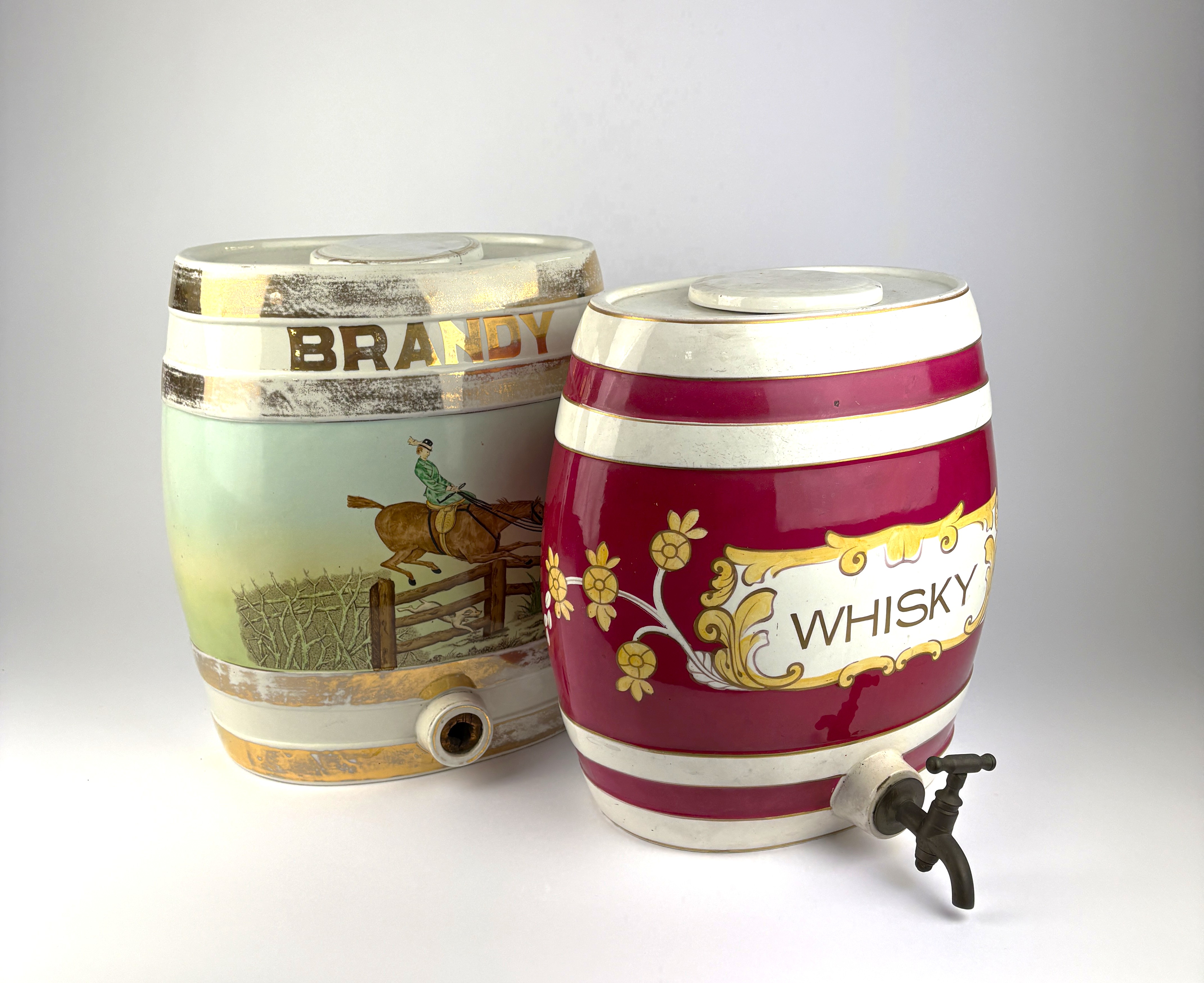 Two antique ceramic spirit barrels, 'Whisky' and 'Brandy', late 19th / early 20th century, 35cm high, (af).