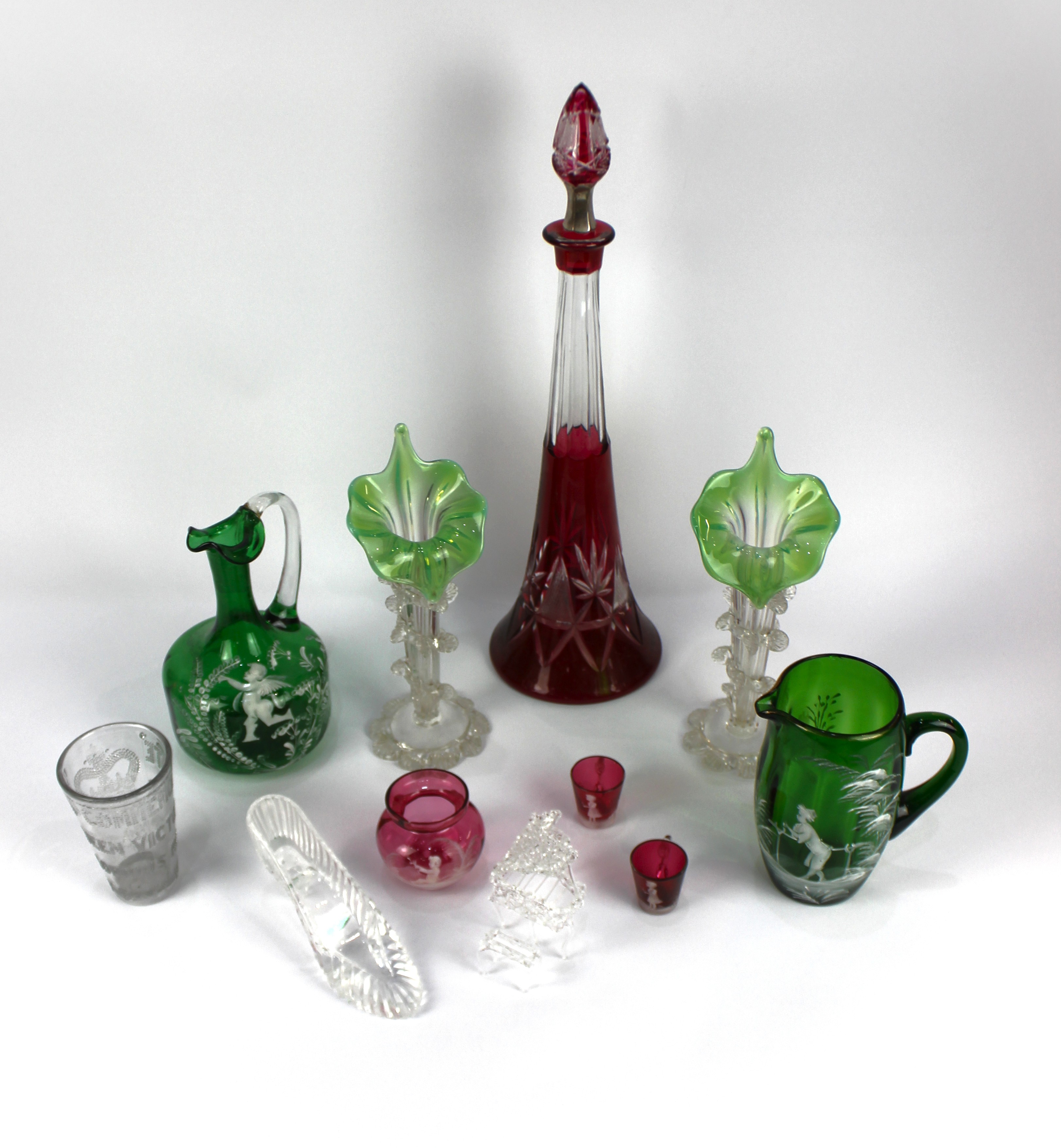 Two Mary Gregory style green glass jugs, together with two Mary Gregory style miniature cranberry glass cups, a Mary Gregory style cranberry glass vase, a glass piano and stool ornament, a Queen Victoria jubillee commeorative glass, a Galway glass slipper, a pair of clear and opalescent green glass Jack in the Pulpit vases, height 25cm and a cranberry flashed glass cut glass decanter, of tapering form, height 46cm (12)