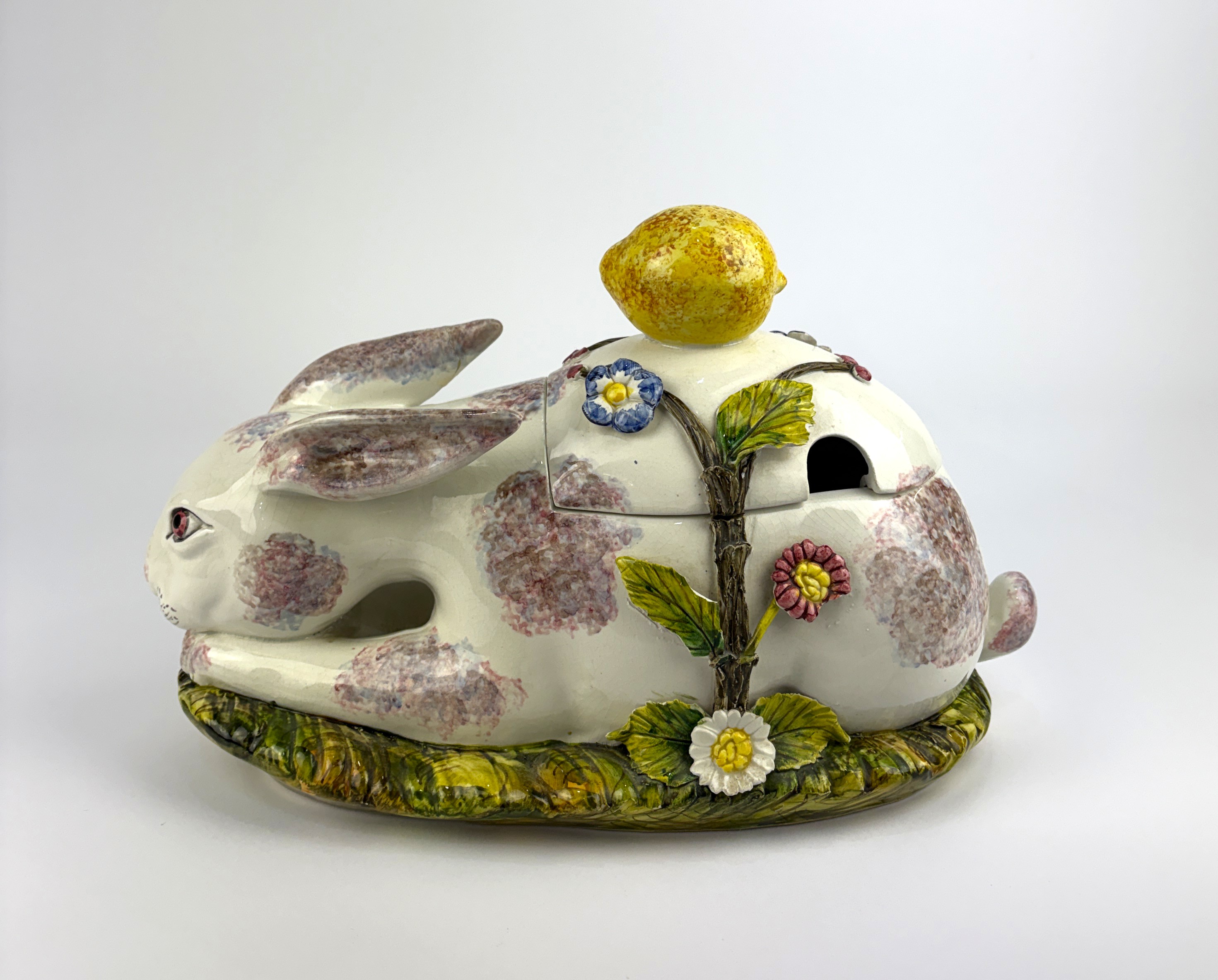 A 20th century Italian maiolica rabbit shaped tureen and cover, mark to base, 22cm high, 33cm long