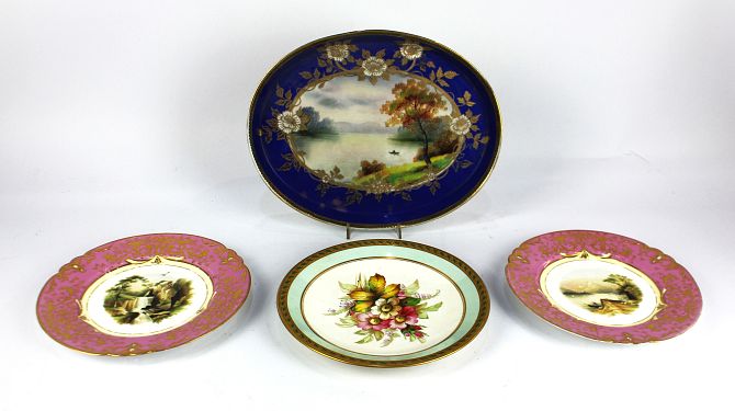 A Victorian Royal Worcester dessert plate, decorated against the duck egg round with gilt band to rim decorated with repeating leaf motif, handpainted with floral bouquet to centre, puce mark to base, diameter 23cm, together with a pair of painted cabinet plate, decorated against the pink ground with gilt repeating floral pattern, handpainted with landscape scenes, diameter 23cm, and a Noritake porcelain tray, of oval form, blue ground with central lake scene, gilt heighted, marked to base, width 32.5cm (4)