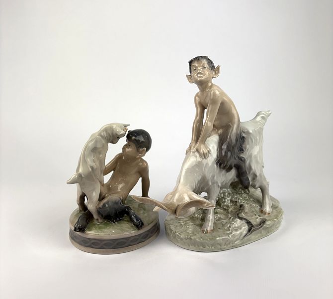 A Royal Copenhagen porcelain figure of a faun riding a goat no 737 21.5cm high, and another of a faun with a goat no 498 13.5cm high (2)