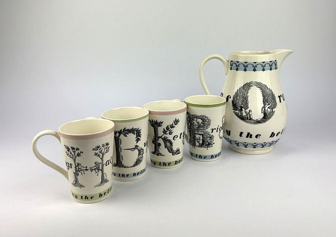 Wedgwood for Liberty's designed by Richard Guyatt, an 'Oranges and Lemons' pottery jug 19cm high, and four beakers decorated with nursery rhymes, printed with vignettes in black on blue, pink and green bands, printed factory marks
